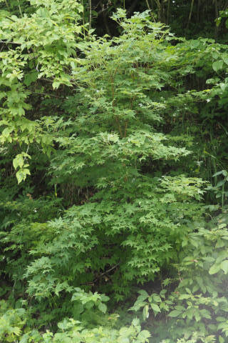 北海道から本州中部地方までの亜高山帯に自生している日本固有種です。株立し高いものだと樹高は8〜10mほどになります。樹皮は灰褐色で縦に浅い筋が入ります。葉身が5〜9cmの葉は5裂または希に7裂する掌状中裂で、それぞれの裂片は浅い切れ込みがあり重鋸歯です。