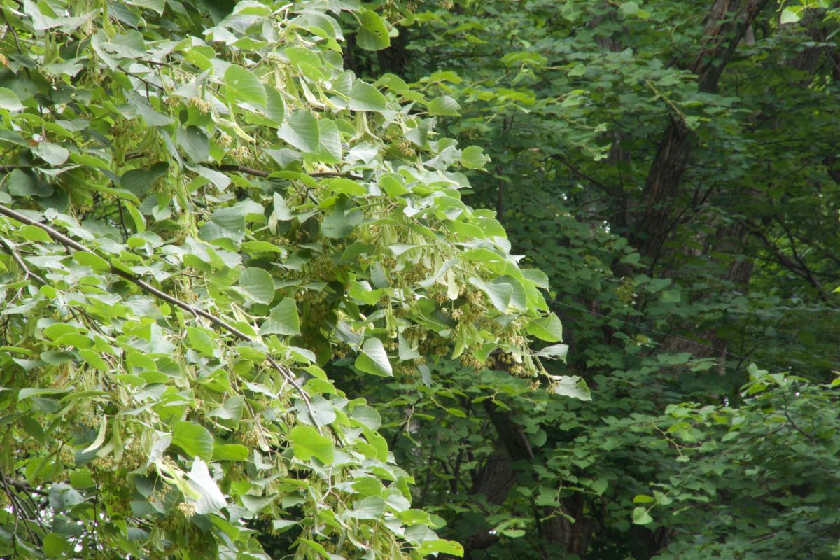 6〜7月に淡い黄色の花を咲かせますが、同属のシナノキと同じように花序の柄に細長い葉のような総苞葉が付きます。