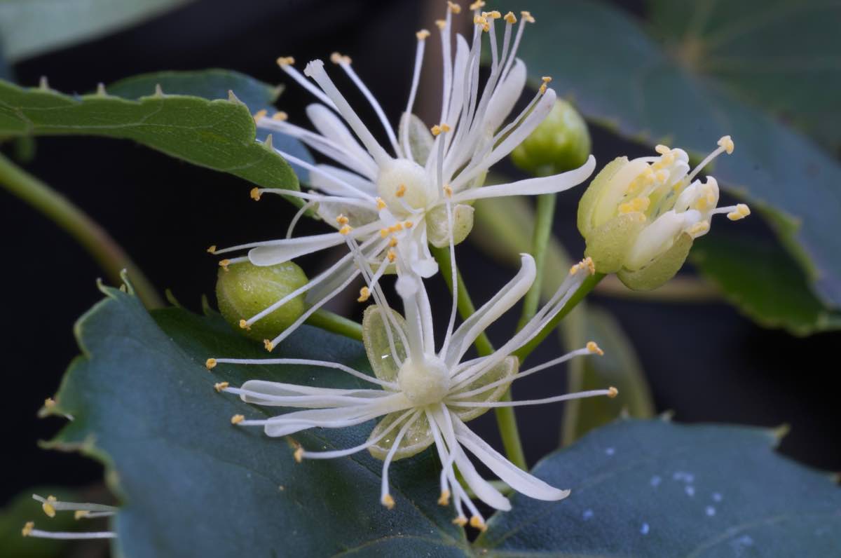 葉は長さ4〜10cmの心円型で葉は左右不相称、先の尖ったハート型です。脈腋には淡褐色の短い毛がまとまってが生えています。