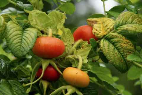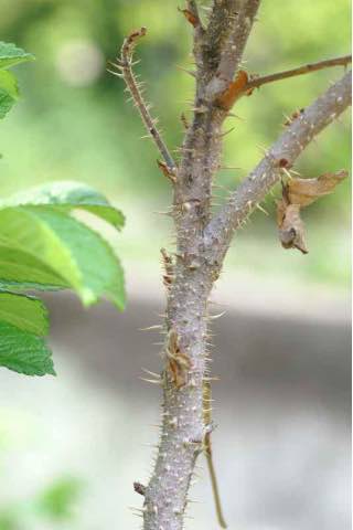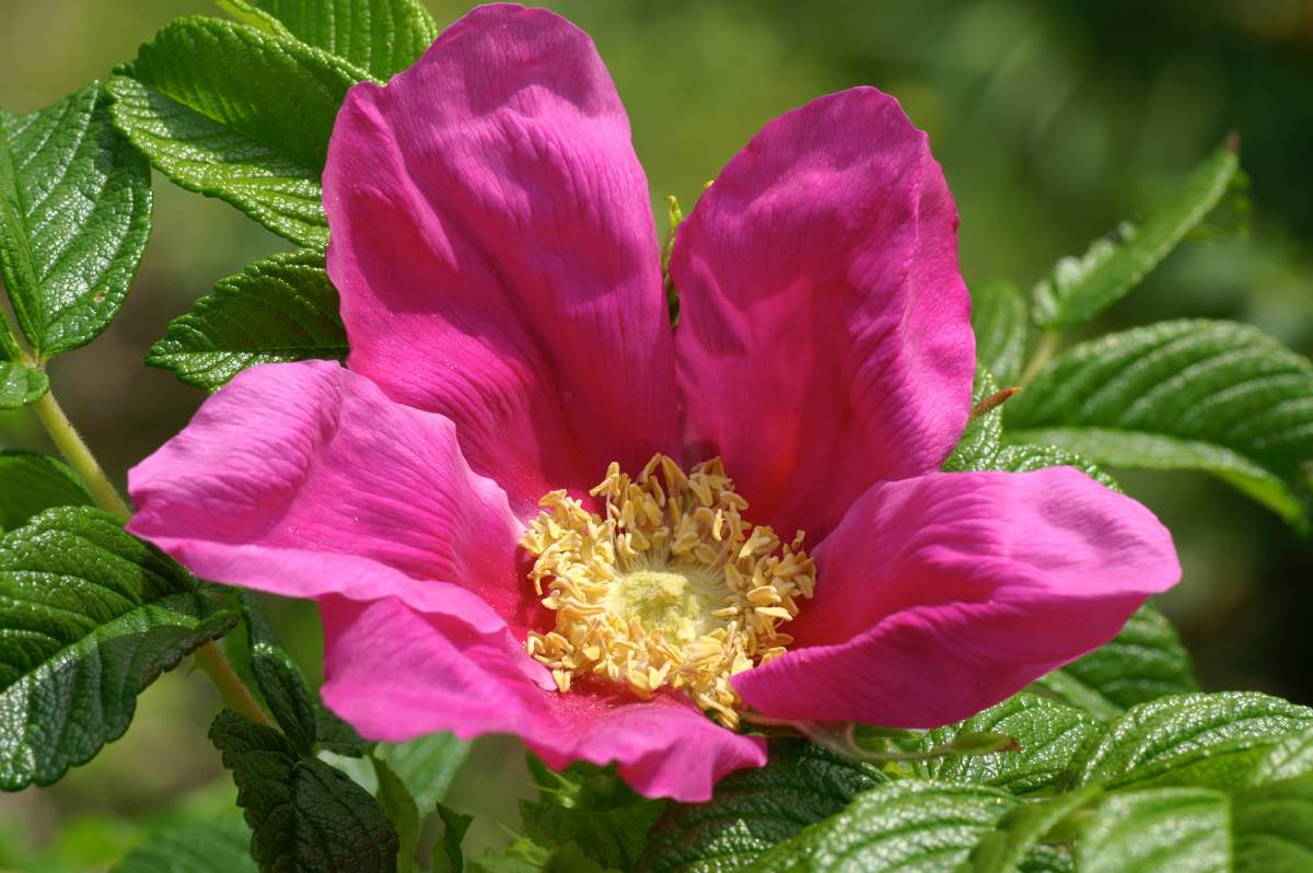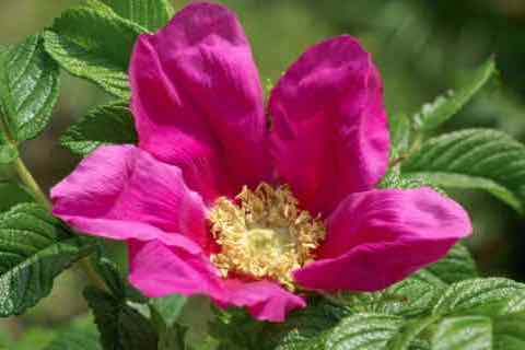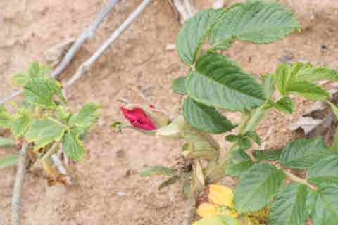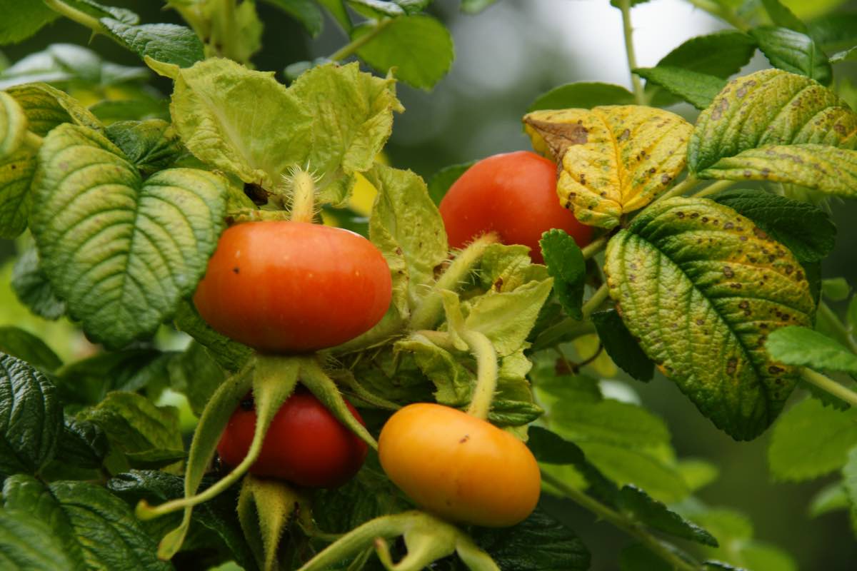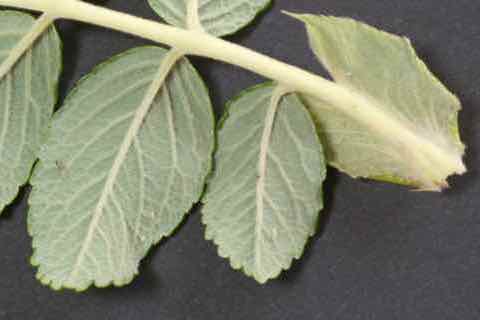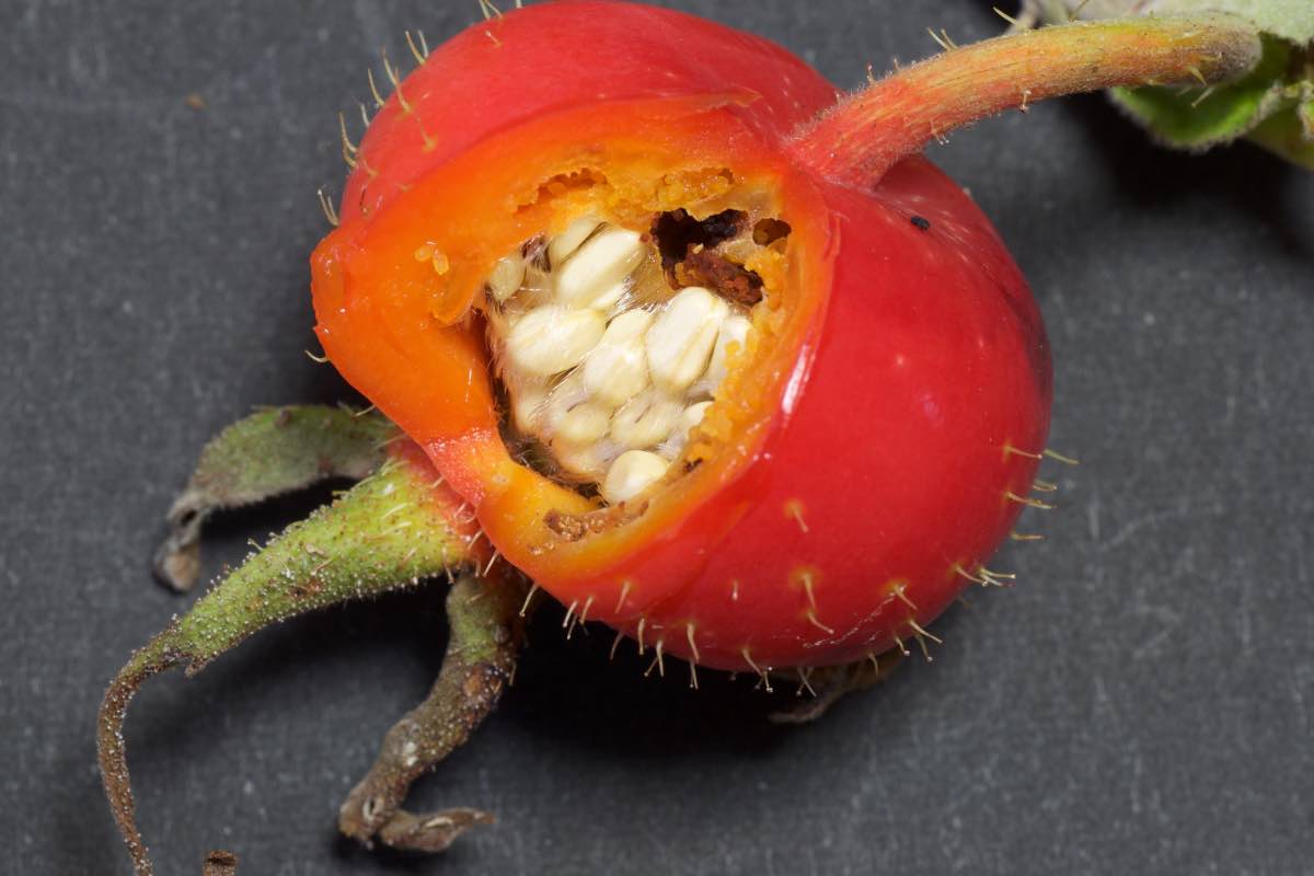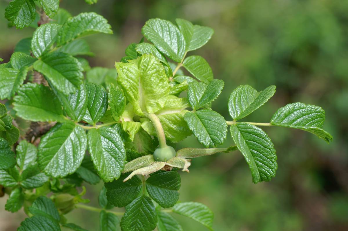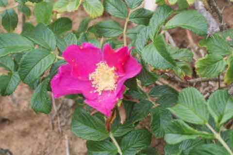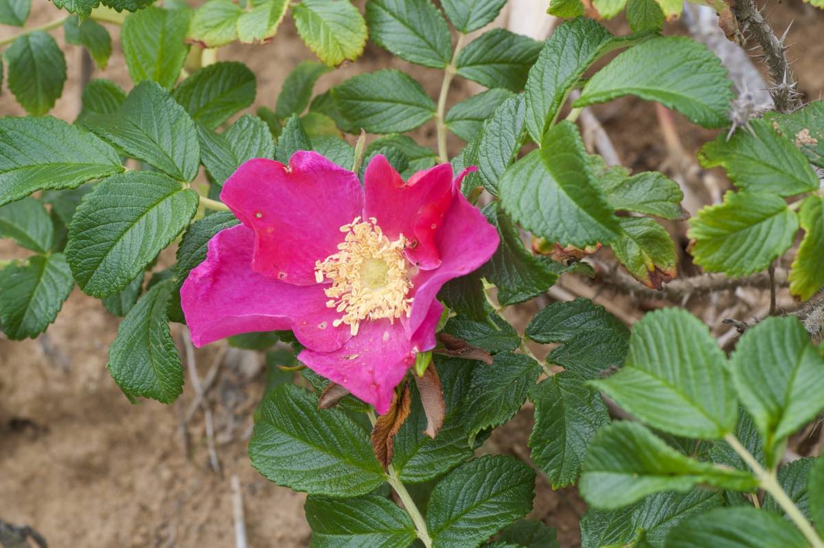 葉は奇数羽状複葉で小葉が7〜9枚あります。小葉の長さは2〜3cmの卵形または楕円形で先端が丸まっており、裏側は軟毛に覆われています。葉縁には鈍い鋸歯があって葉脈は凹んでいます。枝には刺が多く出ています。6~8月に2〜3cmの花弁を持つ赤〜赤紫色の花が咲き、強い芳香があります。果実は平べったい球形になって8〜9月に赤く熟します。