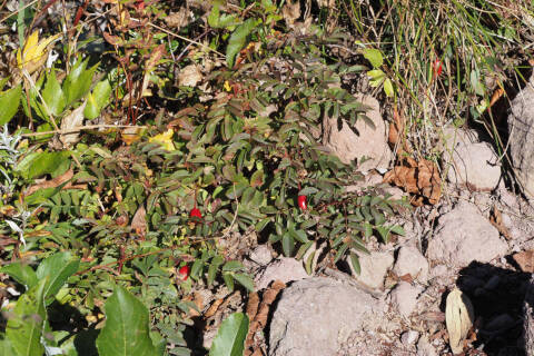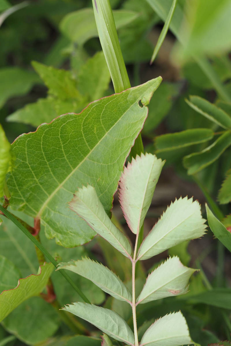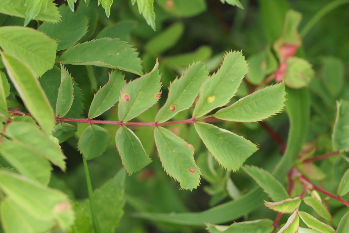 葉は奇数羽状複葉で、楕円形で先端が丸みを帯びた3〜4対ある小葉には鋭い鋸歯があります。