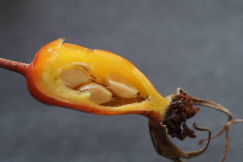 8〜9月に赤く熟す果実は花托が肥大化した偽果です。