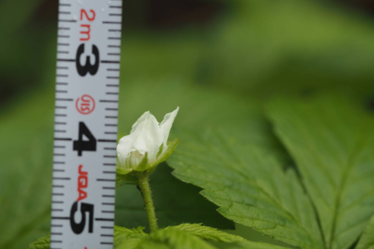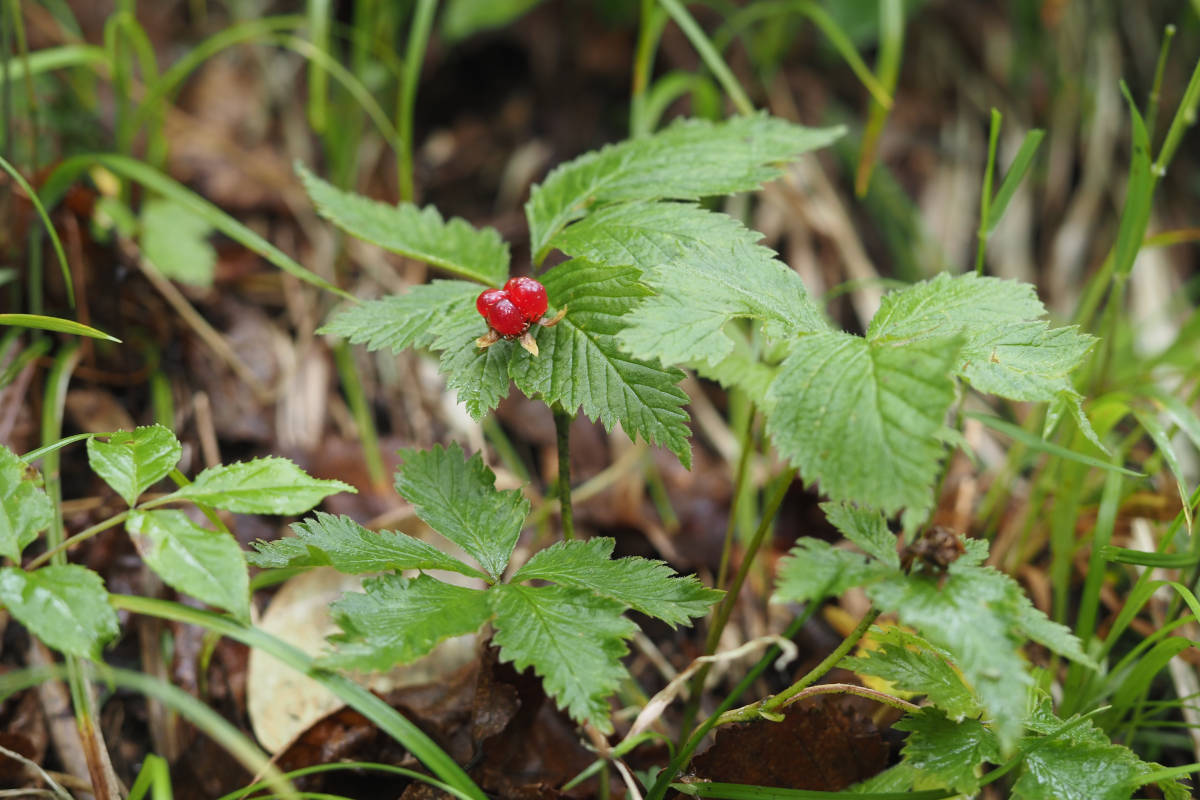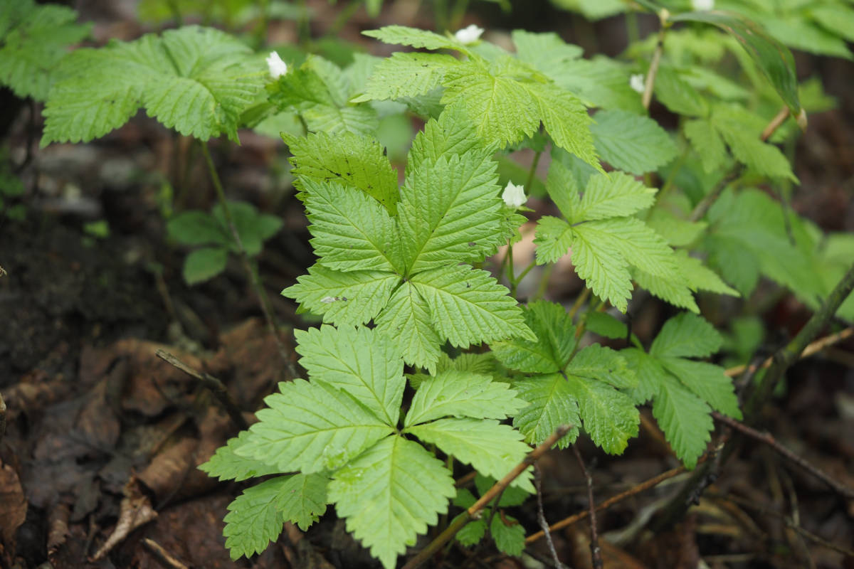 当種は別名をトゲナシゴヨウイチゴといい、ゴヨウイチゴ(Rubus ikenoensis)によく似ていることが想像できます。実際にそっくりなのですが、ゴヨウイチゴには葉柄、花柄から萼、そして茎に棘があり、棘のないヒメゴヨウイチゴとは異なります。また花がまったく異なり、ゴヨウイチゴには花弁がありません。この2つは似ているものの、分子生物学的な系統において、ゴヨウイチゴとヒメゴヨウイチゴは別々の亜属に属すると言ってもいいぐらいに意外と離れているそうです。