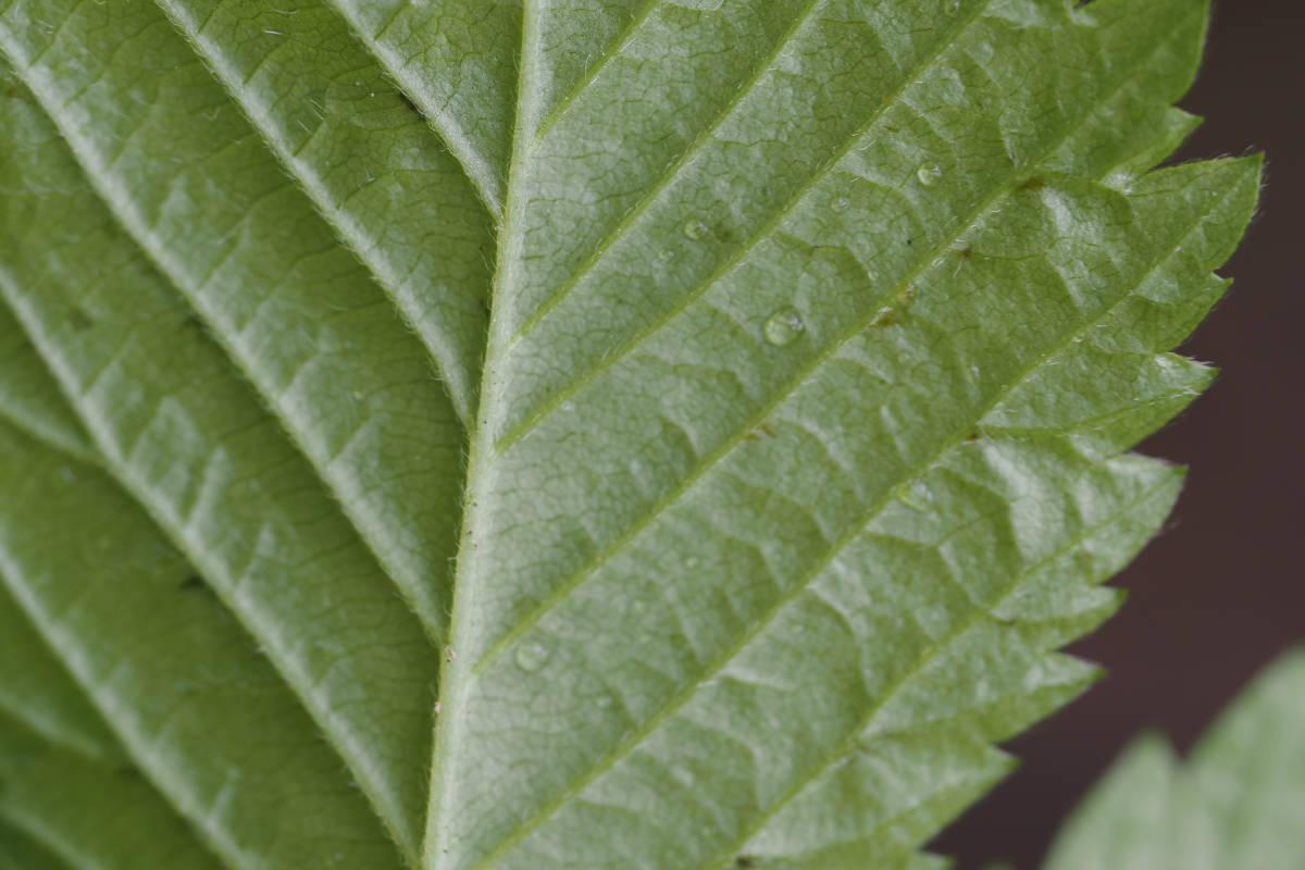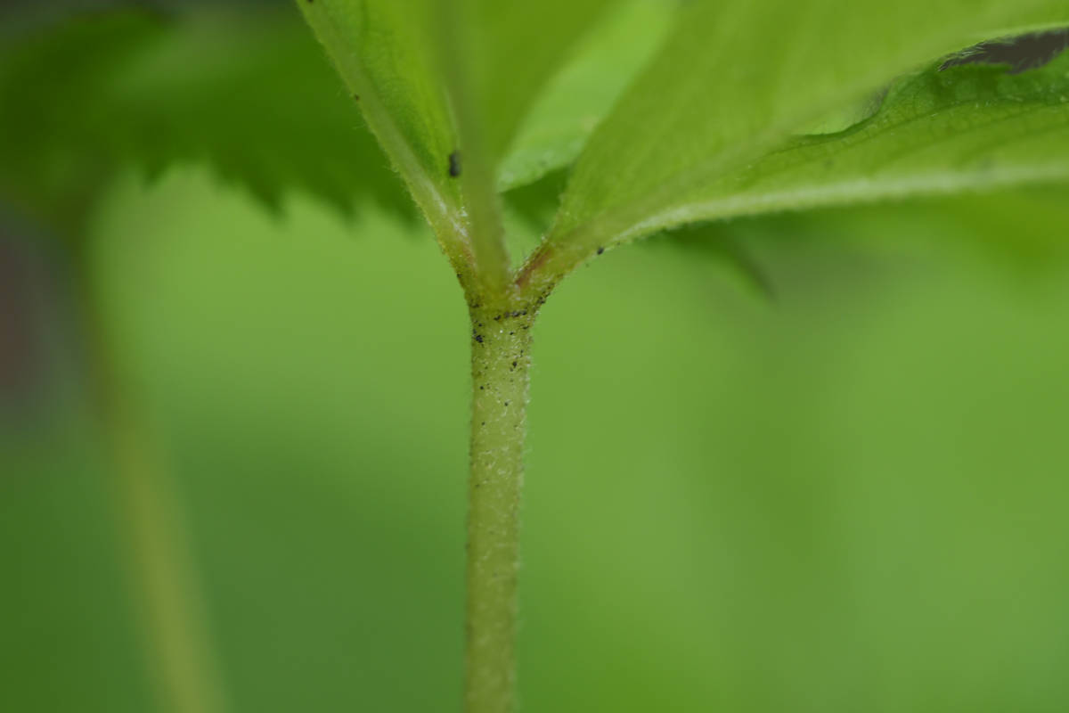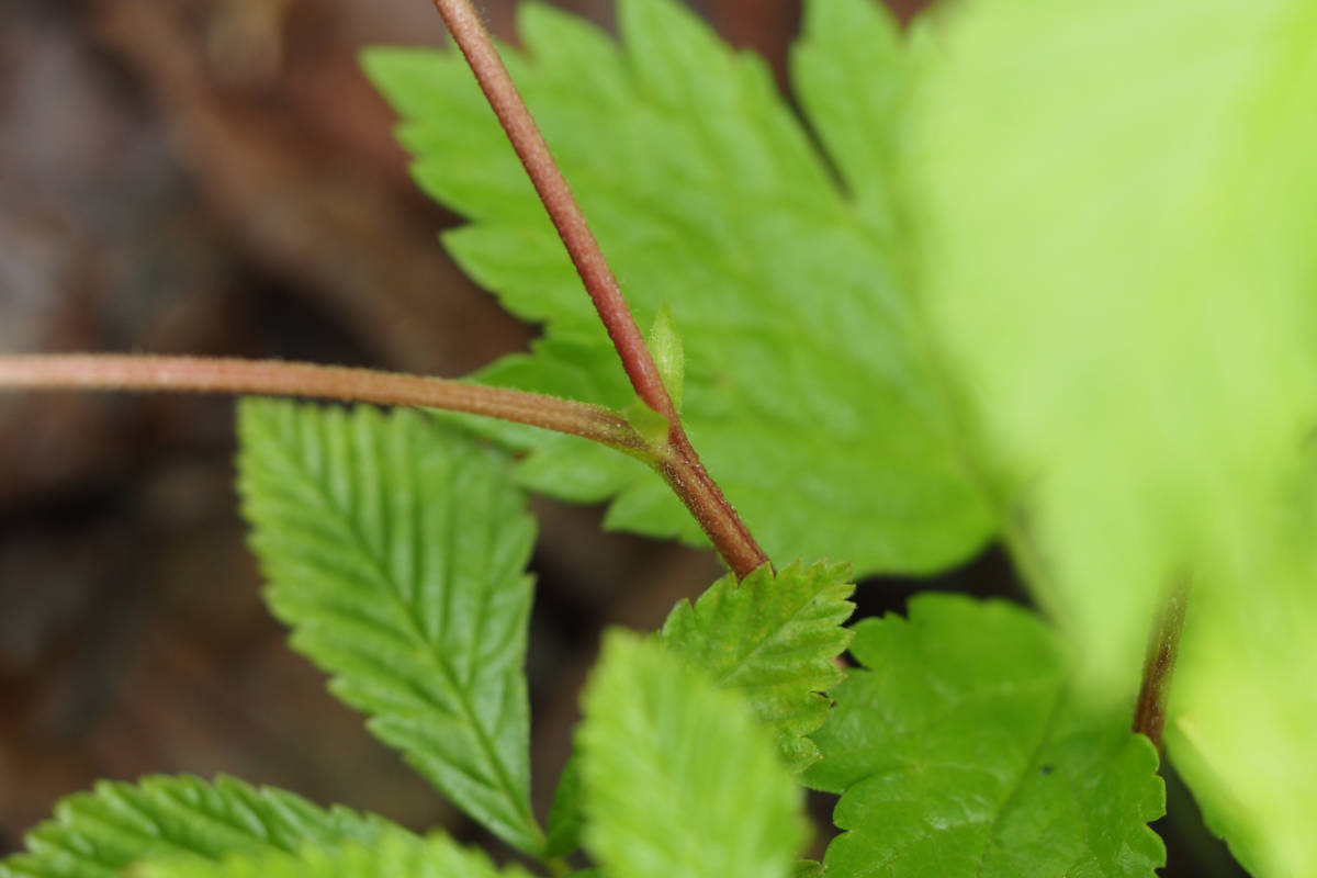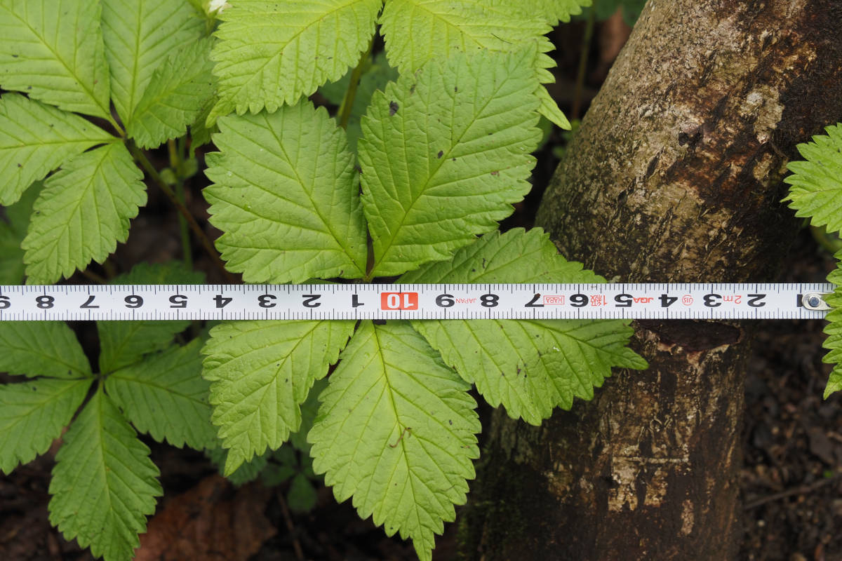 葉は五出複葉で小葉は鋸歯があり、葉裏の特に脈上、葉の表や葉柄には軟毛が生えています。