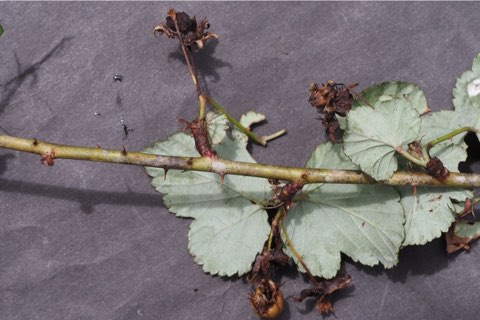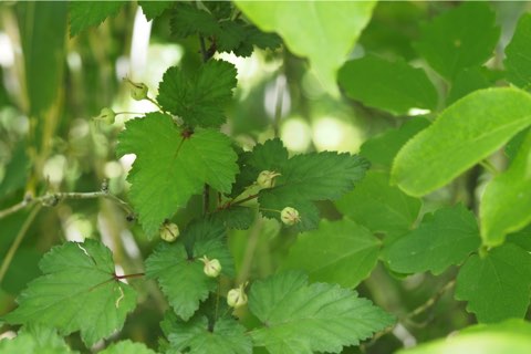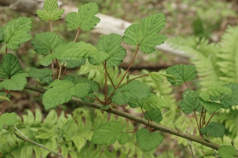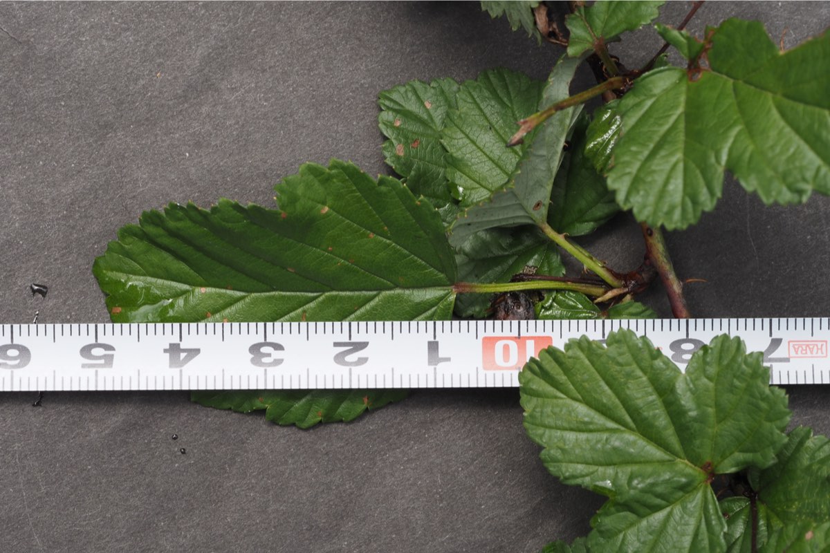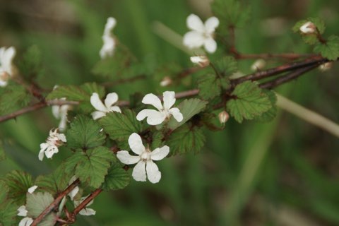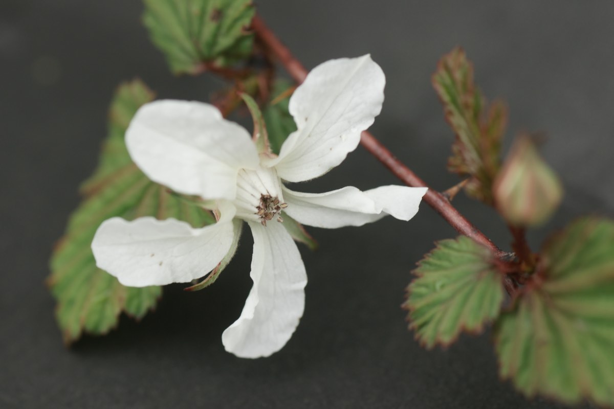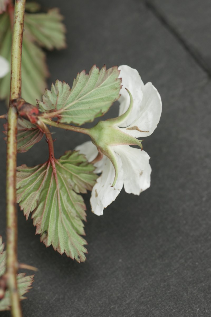 本州から九州までにある山野の林縁や薮、荒れ地に自生しています。樹高は高くて1m程度。茎は基本的に緑色ですが、茶色のまだらが入ったりして均一ではありません。また茎にはろう質の白い粉がつき、細い棘が数多く見られます。葉身は2〜10cmとばらつきますが、花のつく2年生の枝の葉は小さく不分裂葉または浅く五裂する分裂葉がよく見られ、花のつかない1年生の枝の葉は深く3裂する葉を多く確認できます。葉の裏は粉白色を帯び、その脈上や葉柄にも棘があります。4〜5月に咲く白い花は花弁が5枚ありますが、細長く花弁の間に隙間が空くためまるでプロペラのようです。花が咲き終わるといったん萼が閉じ、その中で果実が成熟してから再び萼を開きます。萼の閉じた未熟果は見た目がさながら花の蕾のようです。6〜7月に熟す赤い集合果は甘くておいしいのですが、種子をかみつぶすと苦味が出てきます。[1][2]