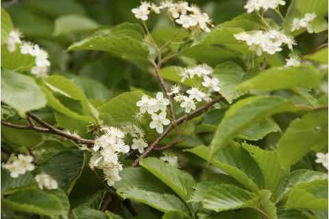 大きさ15mmぐらいのかわいらしい白い花を5~6月ごろに咲かせ、秋には楕円形の小さな赤い実をつけます。秋から冬にかけて葉が落ちてしまっても実が枝に残ることが多く、この実は野鳥のえさになります。本種は種子を付けない凶作の年が度々発生しており、平均して3年に1回しか実を付けないという測定結果もあります。[4]