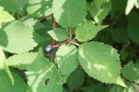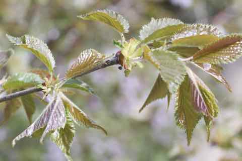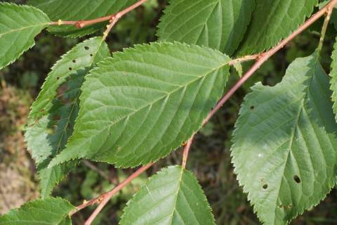 樹皮は紫褐色で、他の同属と同様に特有の横に伸びる皮目が点在します。葉は長さ3〜8cmの卵形で、葉縁には重鋸歯があり、先端が長く尖ります。また蜜腺が葉柄の上側に付いています。5〜7月、葉が展開するのとほぼ同時に直径2〜2.5cmの淡紅色から白色の花を咲かせます。6〜8月には直径7〜8mmの球形の果実が黒紫色に熟します。