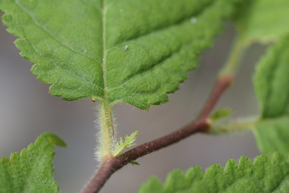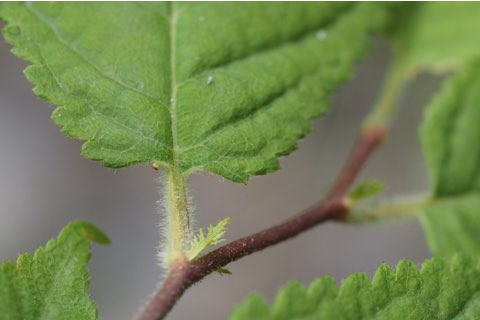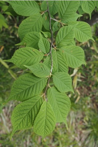 倒卵形な葉の先端は尾状に長く伸び、重鋸歯ですが鋸歯の先には腺がつきます。