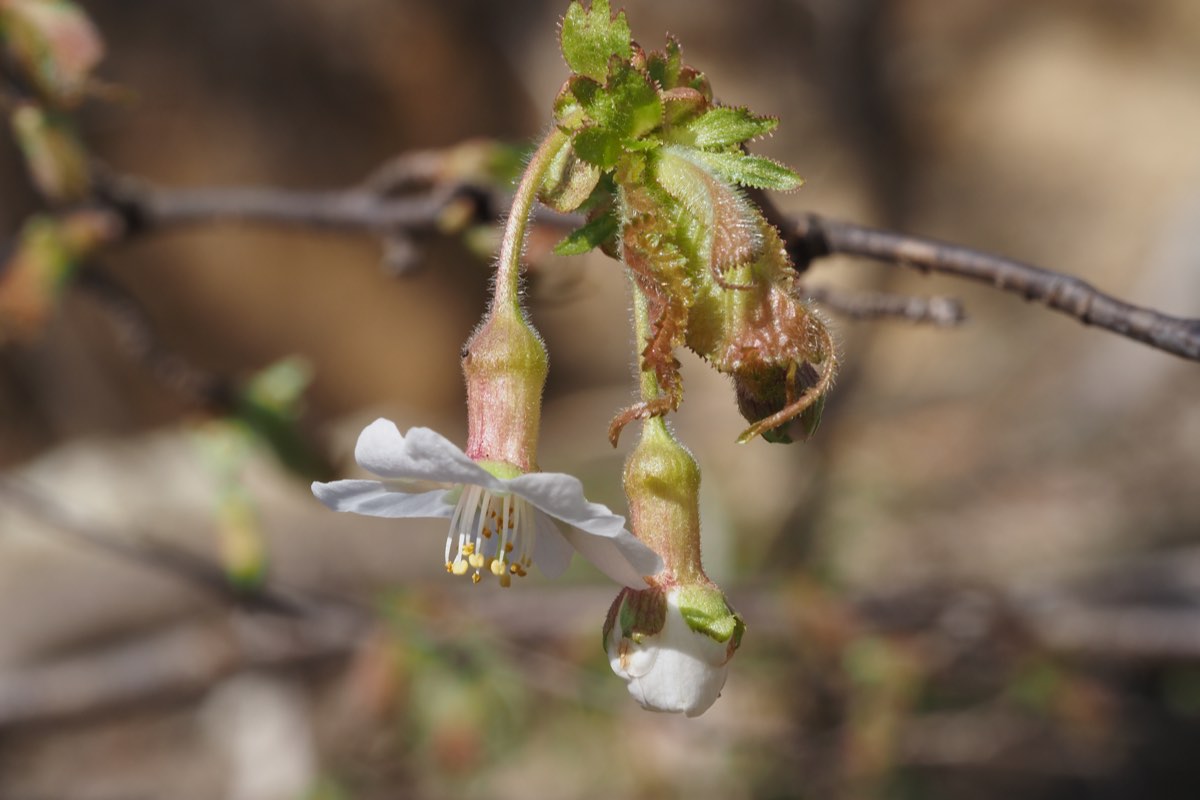 本種は日本固有種で、本州の主に太平洋側と九州の山地に自生しています。九州での自生地は熊本県八代市東部の石灰岩地のみです。樹高は3〜6mほどで、主幹が明確な個体がある一方で、株立ちする個体もあります。他の桜と同様に樹皮は灰褐色で、横に伸びた皮目が見られます。伝統工芸品てある樺細工にこの樹皮を用いたこともあるようですが、主幹の径はそれほど大きくなりません。3〜4月ごろ、葉の展開前か同時に白色または淡紅色の花を1〜3個づつ下向きに咲かせます。花弁は平開するため、萼筒と合わせて横から見ると丁の字に、またスパイスのクローブ(丁子)に似ていることから、その名がついたと言われています。基部が少し膨らむ萼筒、花柱の基部側には開出毛が見られ、萼片には鋸歯があるのが特徴的です。果実は6月に黒く熟しますが、私が食した個体の味は苦味がないものの味の薄いさくらんぼというところでした。果柄にも開出毛が目立ちます。倒卵形な葉の先端は尾状に長く伸び、重鋸歯ですが鋸歯の先には腺がつきます。蜜腺は葉の基部または葉柄に付き、葉柄は毛だらけです。[1][2][3][4]