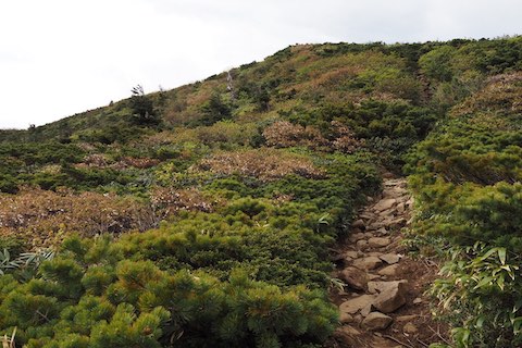 山地の尾根に強風によって横に伸びて広がった樹形となった個体が見られます。