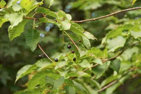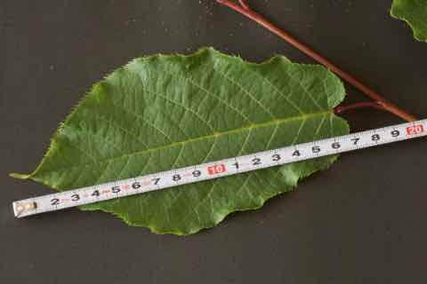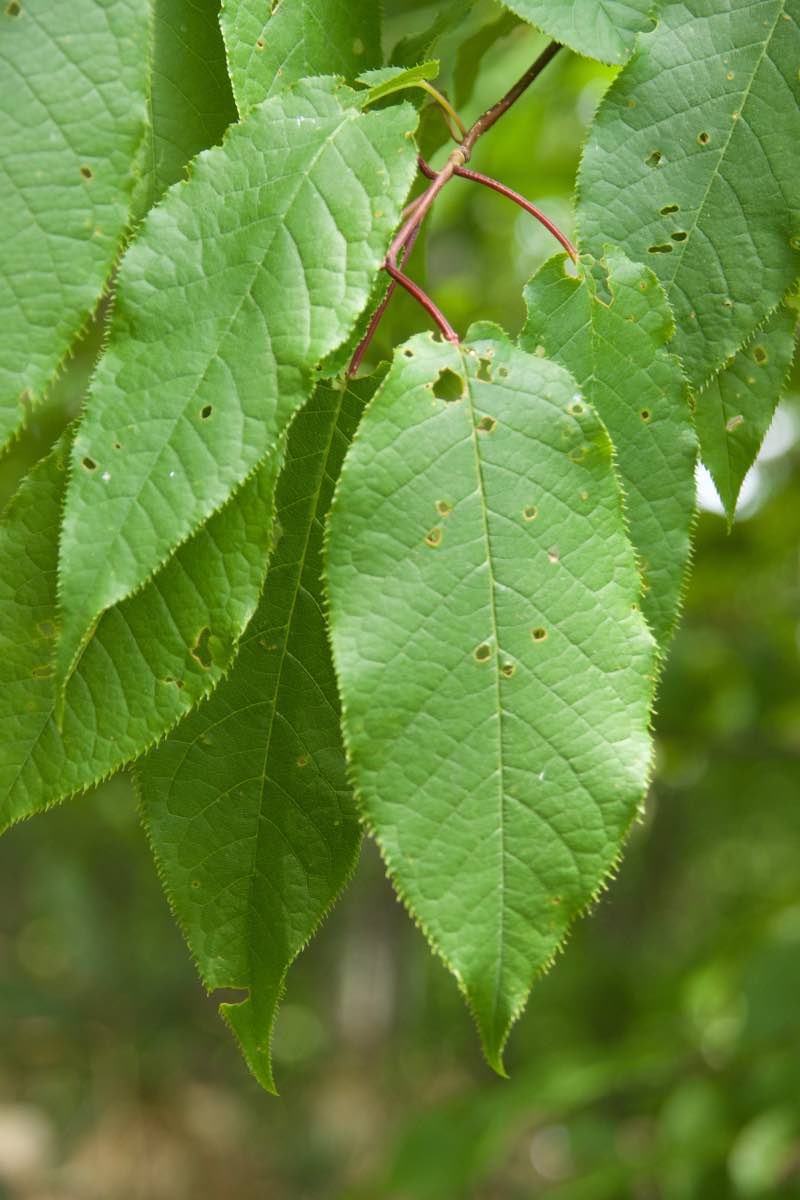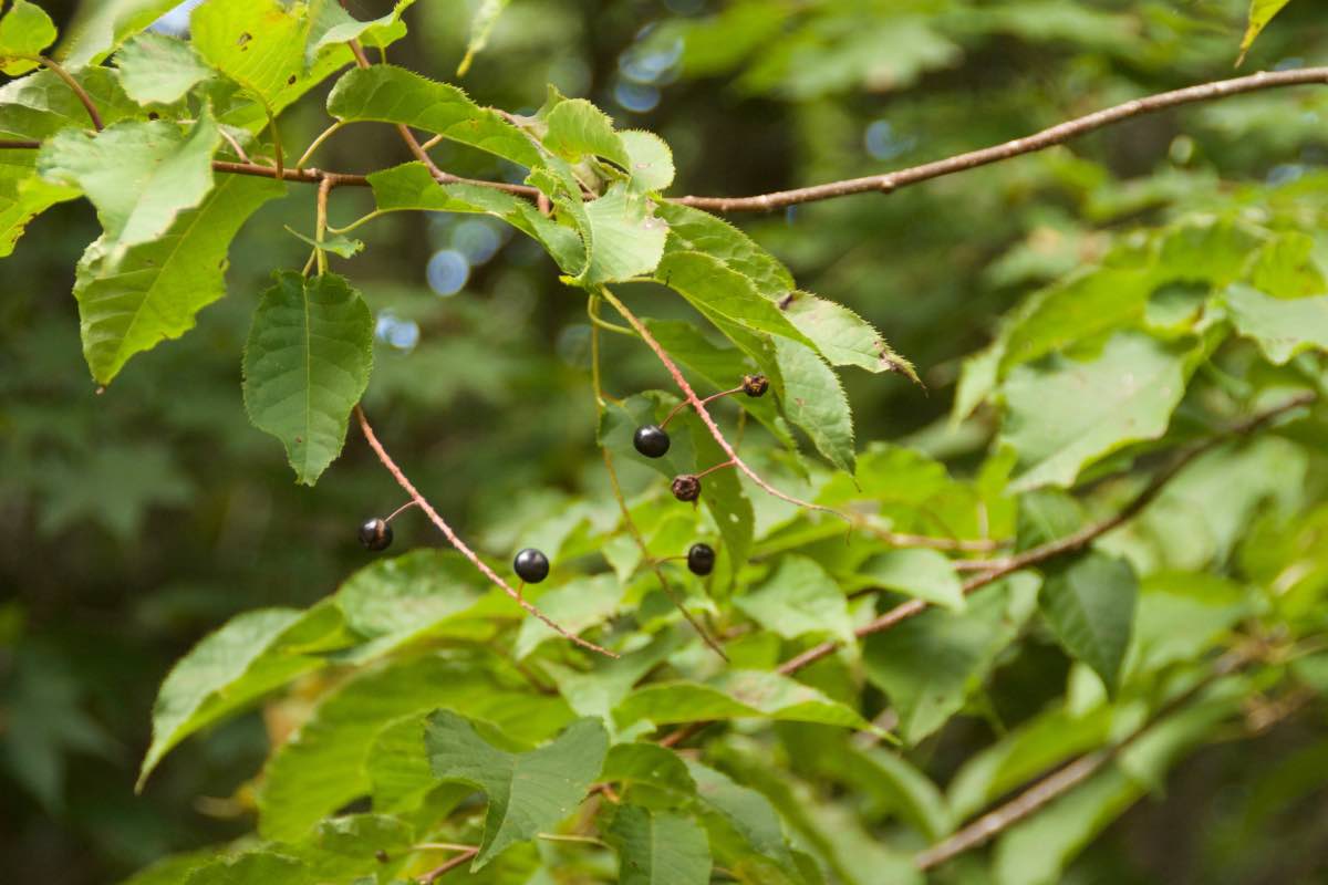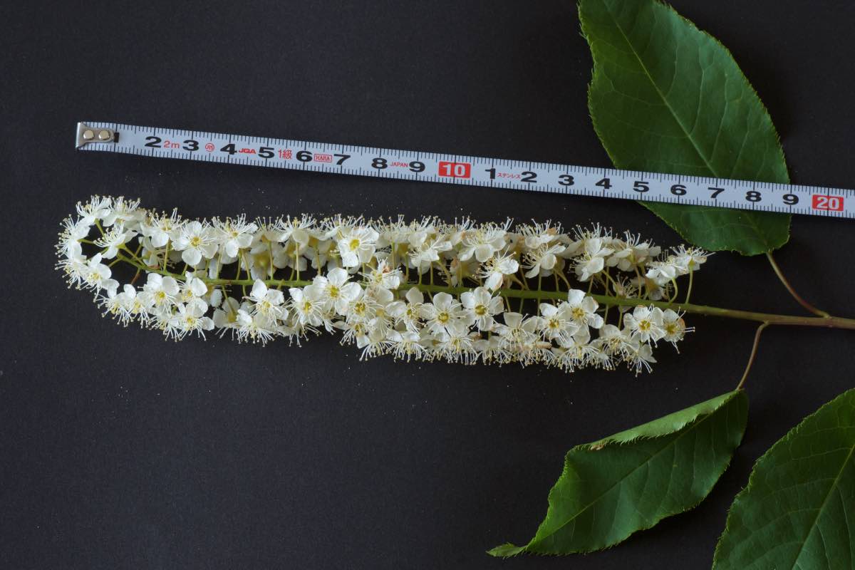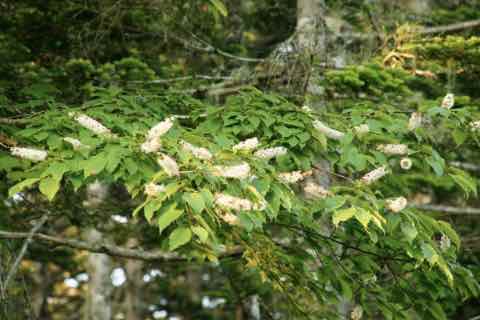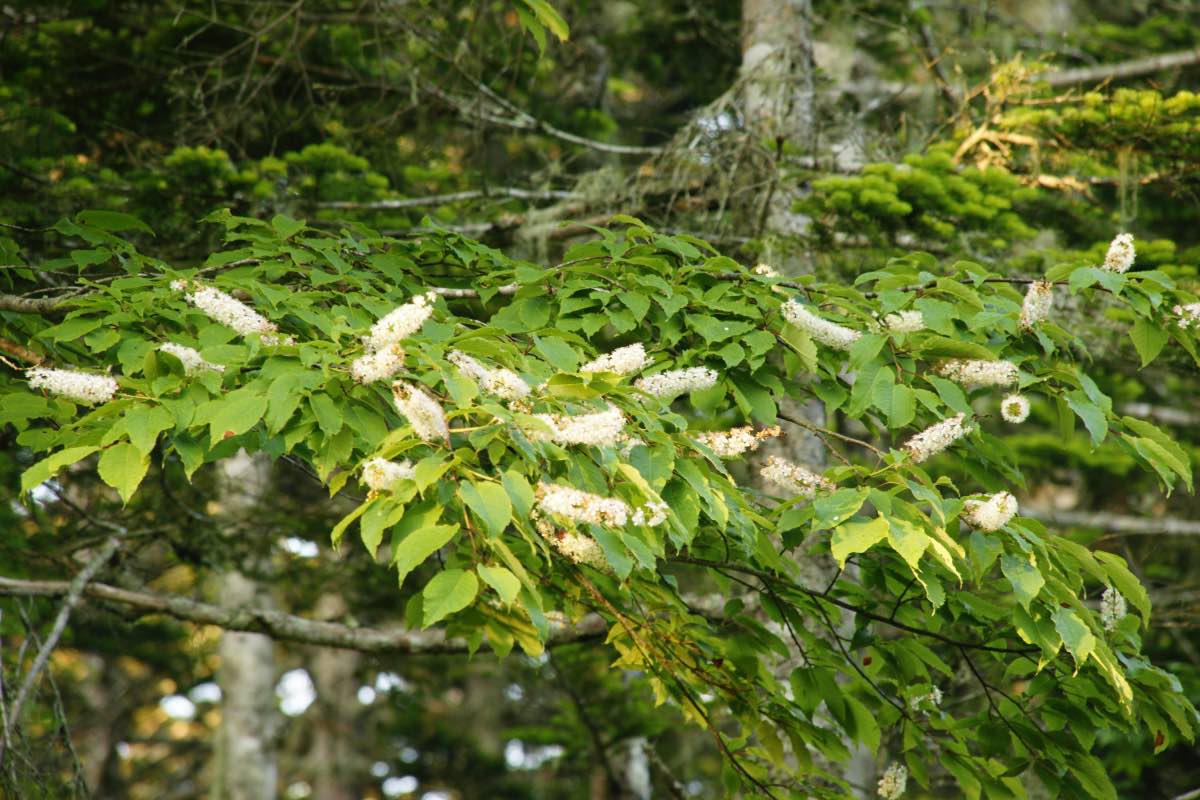 本州中部以北、北海道の川沿いや谷間に生えています。特に北海道でよく見ることができますが、島根県の隠岐島にも自生しているそうです。ミズナラ林や針広混交林に見られ、林分の中層・下層に多く出現します。樹高は10〜15m、最も高いもので28mにもなります。葉の長さは7〜16cmの楕円形で同属の中で最も大きくなり、細かくて鋭い鋸歯があります。基部はハート形です。葉柄の長さは2〜4cmで上側が凹状になっていて、蜜腺が葉柄の上側にあります。樹皮は淡い褐色をしており、縦に浅い裂け目が入ります。花は同属と同様にブラシ状の総状花序です。花序は15〜20cmと同属の中で最も長く、直径10mm前後の小さな白い花が5〜6月に多数咲きます。果実は多少扁平な球形で、8〜9月に紫がかった黒色に熟します。[1][2][3]