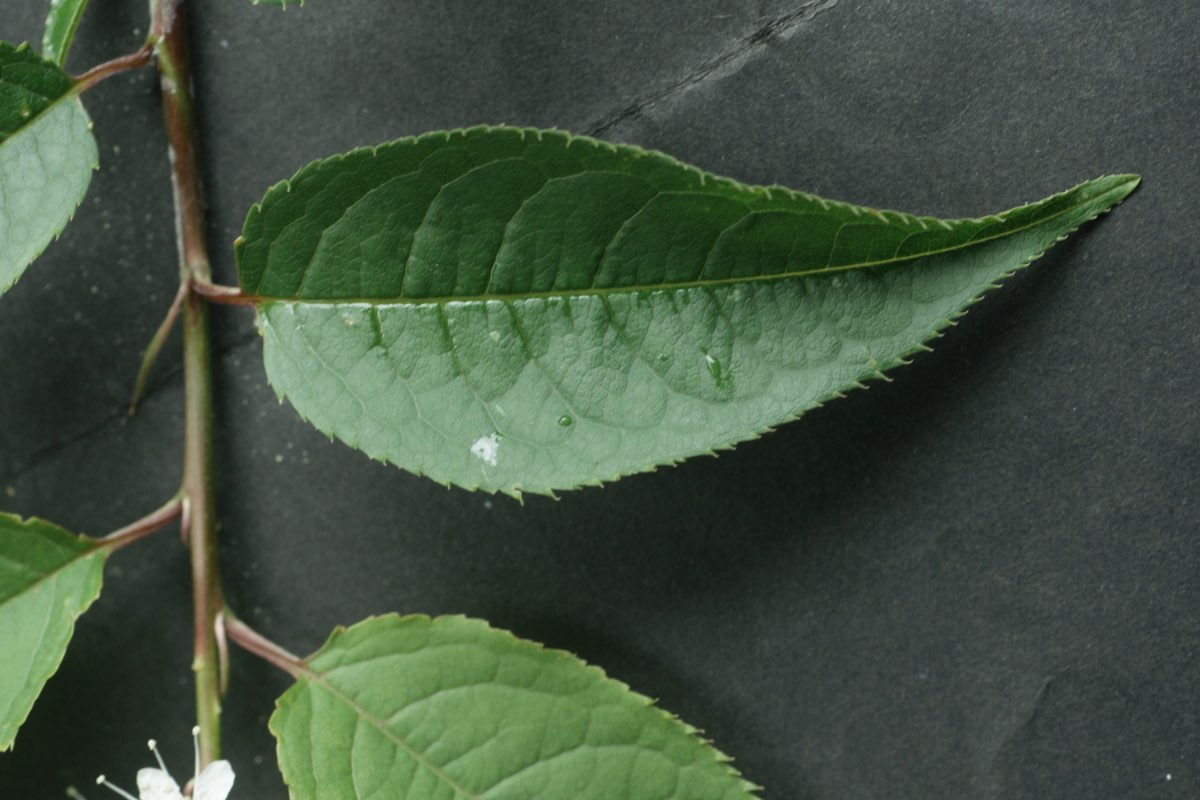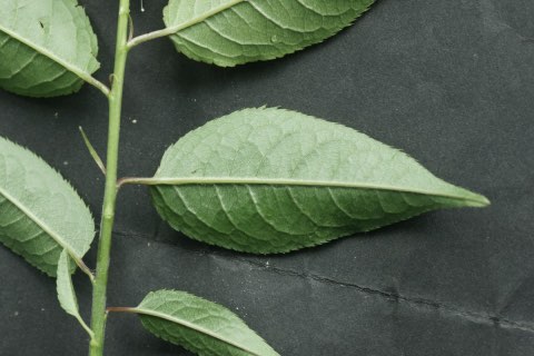 葉は葉身が8〜11cmの楕円形で先が細く尖り、鋸歯があります。