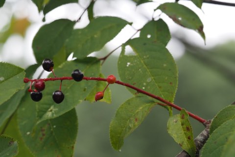若い頃の果実は枝についていますが、少しずつ落ちて、黒く熟す8〜9月ごろまで残るのはわずかです。