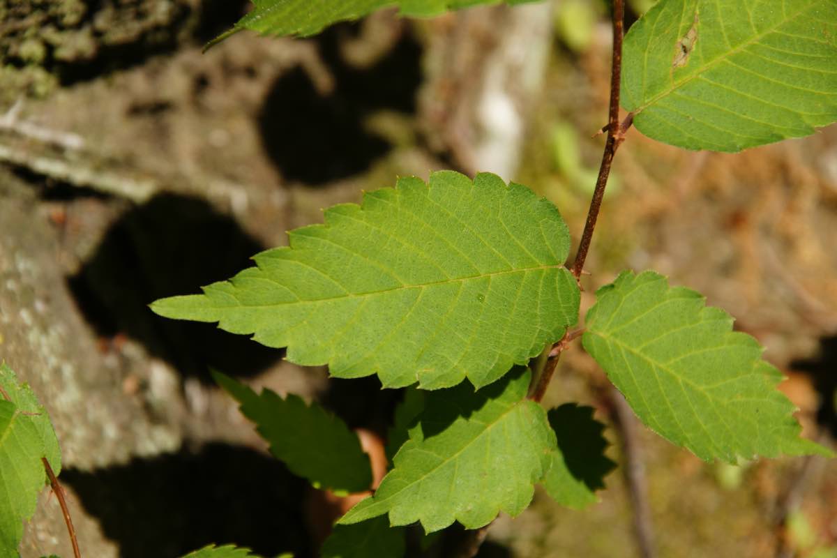 本州から九州まで広く生えています。樹高は20~25m、中には50mに達する大木になるものもあります。樹皮は灰白色ですが、老木になると一部が鱗のように剥けてまだら模様になります。葉の長さは3〜7cmの卵形で先端が長く尖り、鋭い鋸歯があります。ちなみに学名の付けられた「serrata」は鋸歯があるという意味です。4〜5月になると葉の展開と同時に小さな雄花と雌花を咲かせます。2つの角を持った径4mmほどの果実が10月に熟します。[1][2][3]