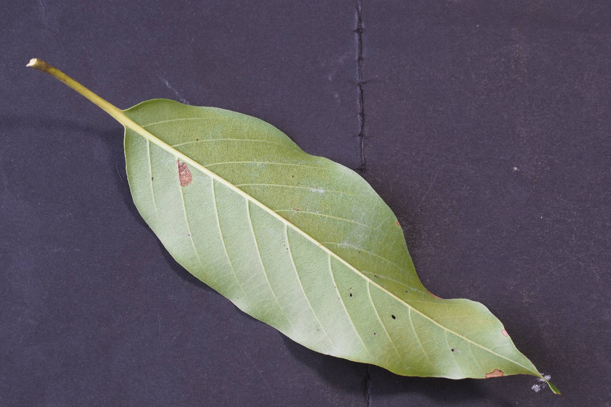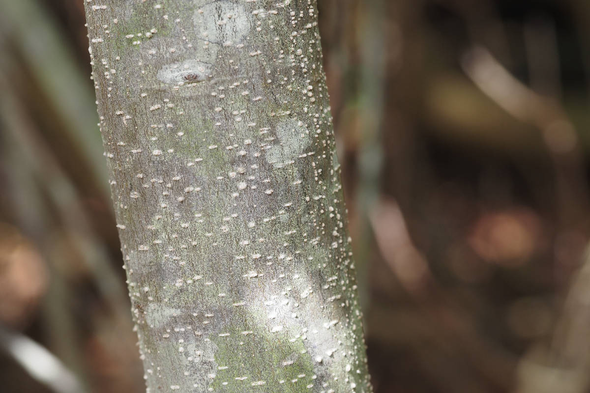 山地に多く生え、高さは20mほどになります。葉の長さは8〜20cmですが葉柄が2〜4cmと長めです。カシの中では全縁なのが特徴的です。5〜6月に花が咲き、多数の雄花序がヒモのように垂れ下がります。雌花序は新しい枝の葉腋から出ますが、長さが1cmもなく目立ちません。雄花序も雌花序も軟毛で覆われています。実はドングリで、花が咲いてから2年目の秋に成熟します。樹皮は緑灰黒色ですが、老木になると鱗のようにはがれて橙色や茶色のまだら模様になります。[1][2][3]