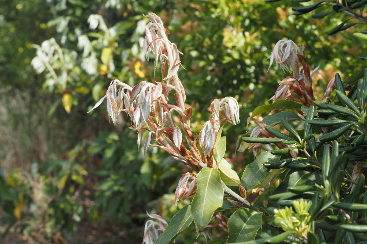 カシと名が付く樹木の中で寒さに強いのは、冬芽や葉が凍結しにくい「耐凍性」が比較的高いためです。本種の細胞は−15℃まで凍らないそうです。材の赤みが強いため、アカガシと呼ばれたといわれています。材は堅く粘りがあり、建築材や器具材など他のカシの仲間と同様、用途は多岐にわたります。材の赤みが重厚に見えて、価格も比較的安価なことから、木刀にはアカガシがよく用いられています。また樹皮を胃薬に用いたという例もあるようです。[5][6][7]