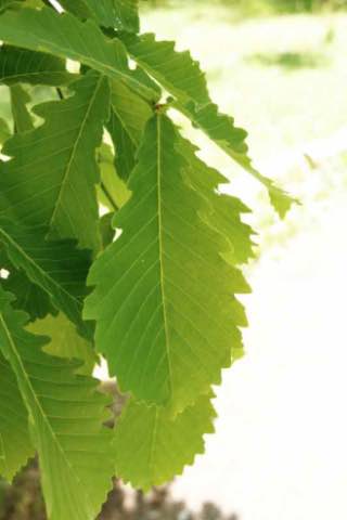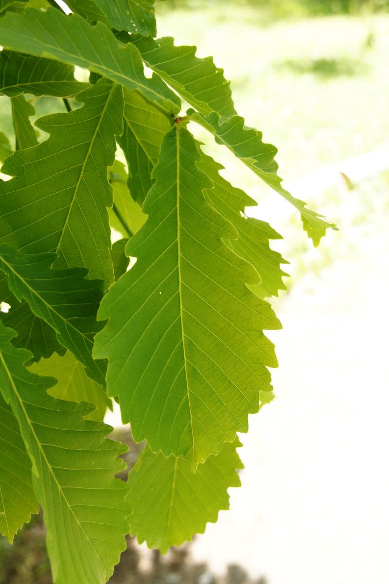 葉は長さ7〜15cmと大きく同属のカシワによく似ていますが、それよりも薄く、鋸歯が鋭くなっています。
