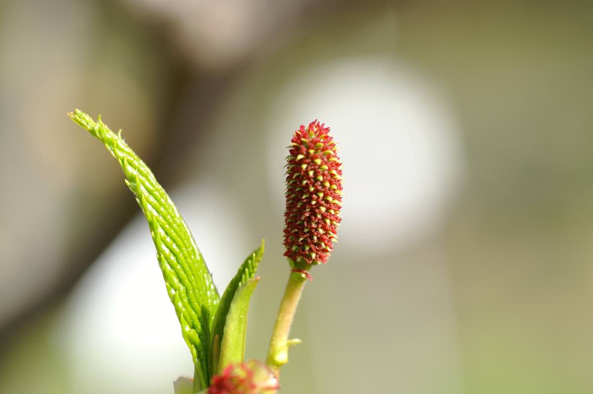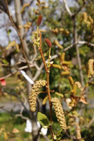 一方で、花粉症を引き起こす代表的な樹木でもあります。六甲山系では古くから治山を目的として多量に植栽されており、この麓に在住する方が、オオバヤシャブシの花粉を原因とする花粉症患者として昭和62年に国内で初めて確認されたそうです。当花粉症は果物アレルギーを併発し、リンゴや桃といった特にバラ科の果物を食べると口の中が痒くなったりします。果穂にはタンニンが多く黒色染料に用いられました。その名は大きい葉のヤシャブシという意味ですが、ヤシャブシは、熟した果穂を鬼神である「夜叉(ヤシャ)」に見立て、タンニンを利用する「五倍子(フシ)」の代用品だったことから名付けられたと言われています。
