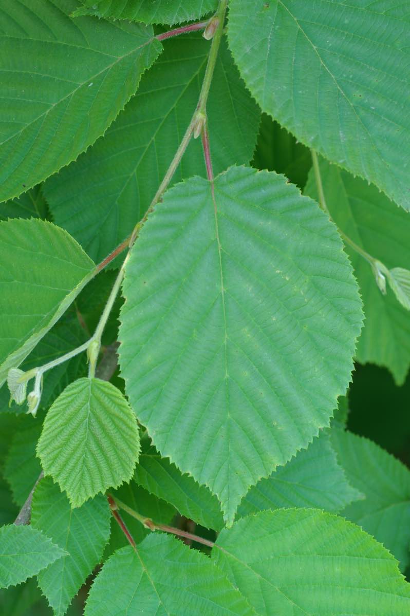 北海道から九州までの山地に生えています。株立ち樹形で樹高は2〜4mになります。樹皮は灰褐色です。葉は長さ5~11cmの卵形で先端は尖っており、荒い鋸歯があります。若い葉には紫色の斑紋がありますが大きくなると消えます。葉が展開する前の3〜5月に雌花と雄花が咲きます。雄花は、カバノキ科に共通してみられる尾状の花序です。一方の雌花はまるでイソギンチャクのように赤い柱頭を出します。9〜10月に熟す果実は大きさ1〜2cmほどの円錐形で、雌花を包んでいた苞が大きくなって果実を包み込み動物の角のように細く尖ります。[1][2]