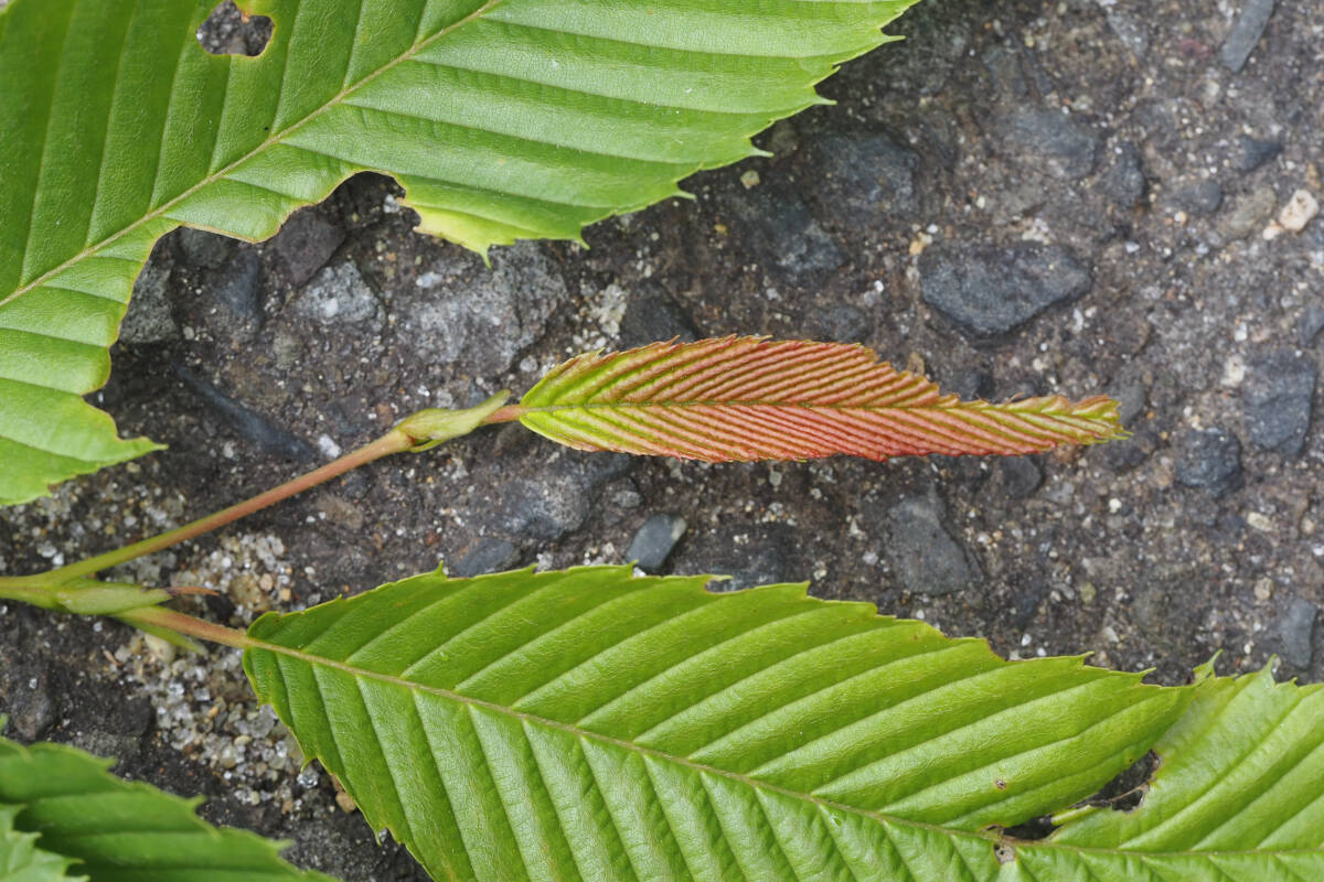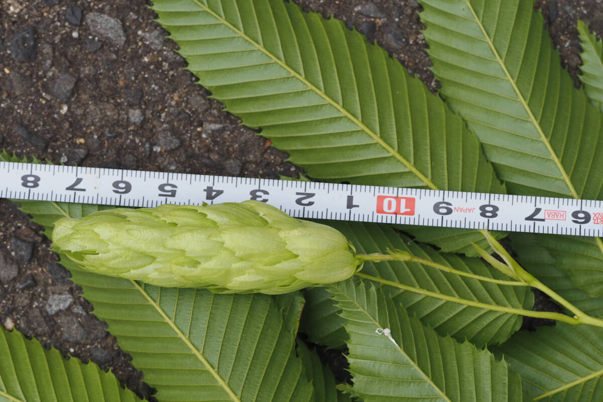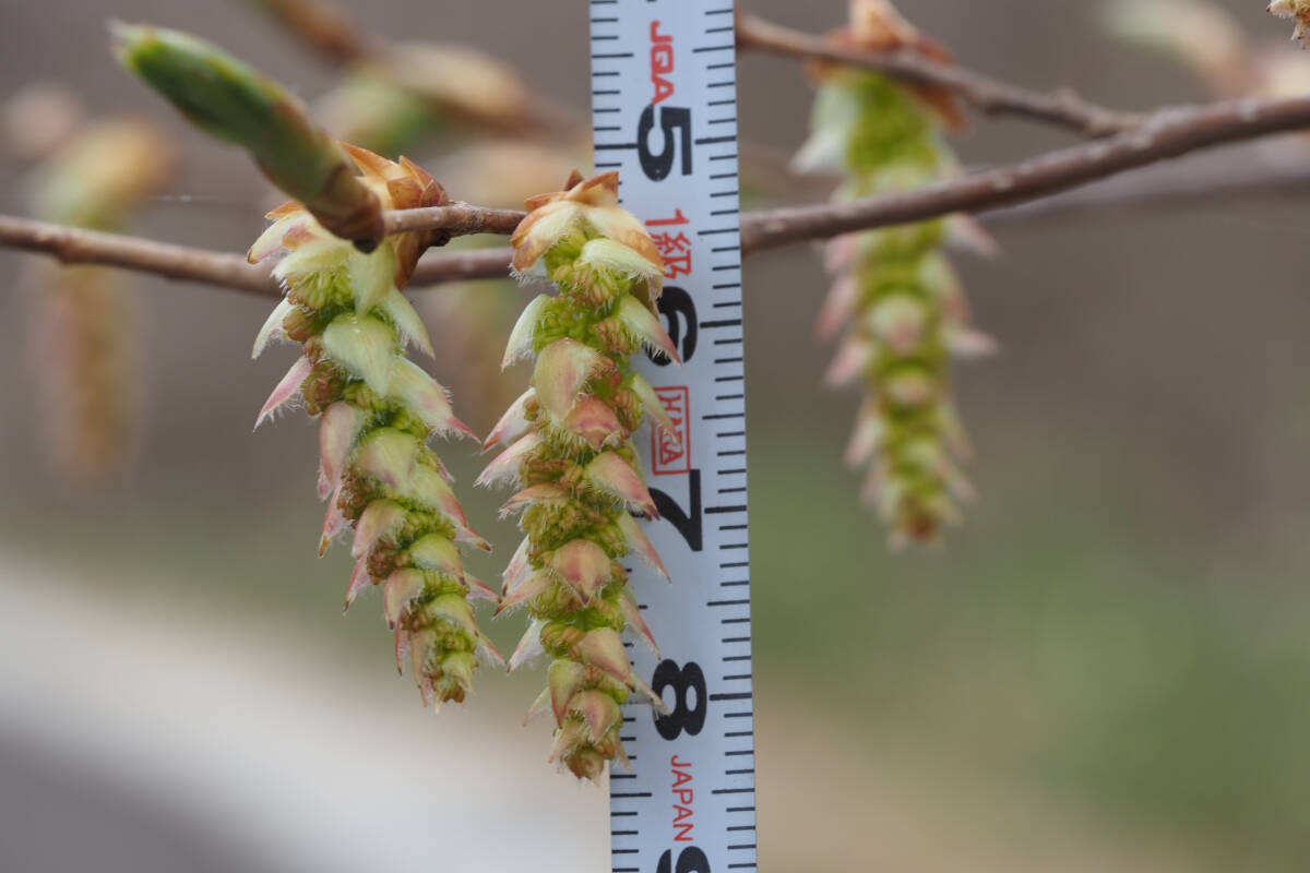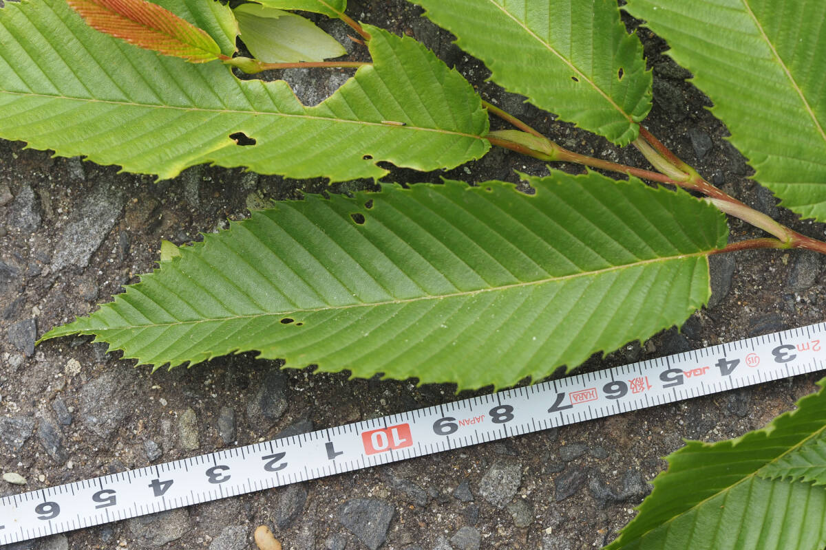 本州から九州までの日当たりの良い山地や丘、また谷筋まで広い領域に生育している日本固有種です。樹高は15mほどになり、樹皮は黒褐色。若い個体はイボ状の皮目が目立ち、生長するにつれてその皮目が縦に連なってミミズばれ状になり、老木になるとその部分が裂けて剥がれてきます。葉が展開する4月、同時に花を咲かせます。雄花序と雌花序があり、長さ3〜5cmの雄花序は前年枝の複数箇所から垂れ下がり、長さ2cmほどの雌花序は枝の先端もしくは先端近くにある短枝の腋から垂れ下がります。雌花からベロを出すかのように突き出ているのは花柱です。長さが5〜10cmの果穂に60個前後つく果実は10月ごろ熟しますが、葉状の果苞の基に堅果が付着していて、これが竹トンボの羽のような役割をして落下時に散布されます。数多くの果苞に包まれた果穂はさながら蓑を被ったミノムシです。葉身が5〜12cmある狭楕円形の葉には15〜24対の側脈があり、葉の裏に突き出ています。[1][2][3]