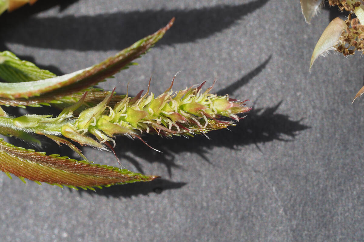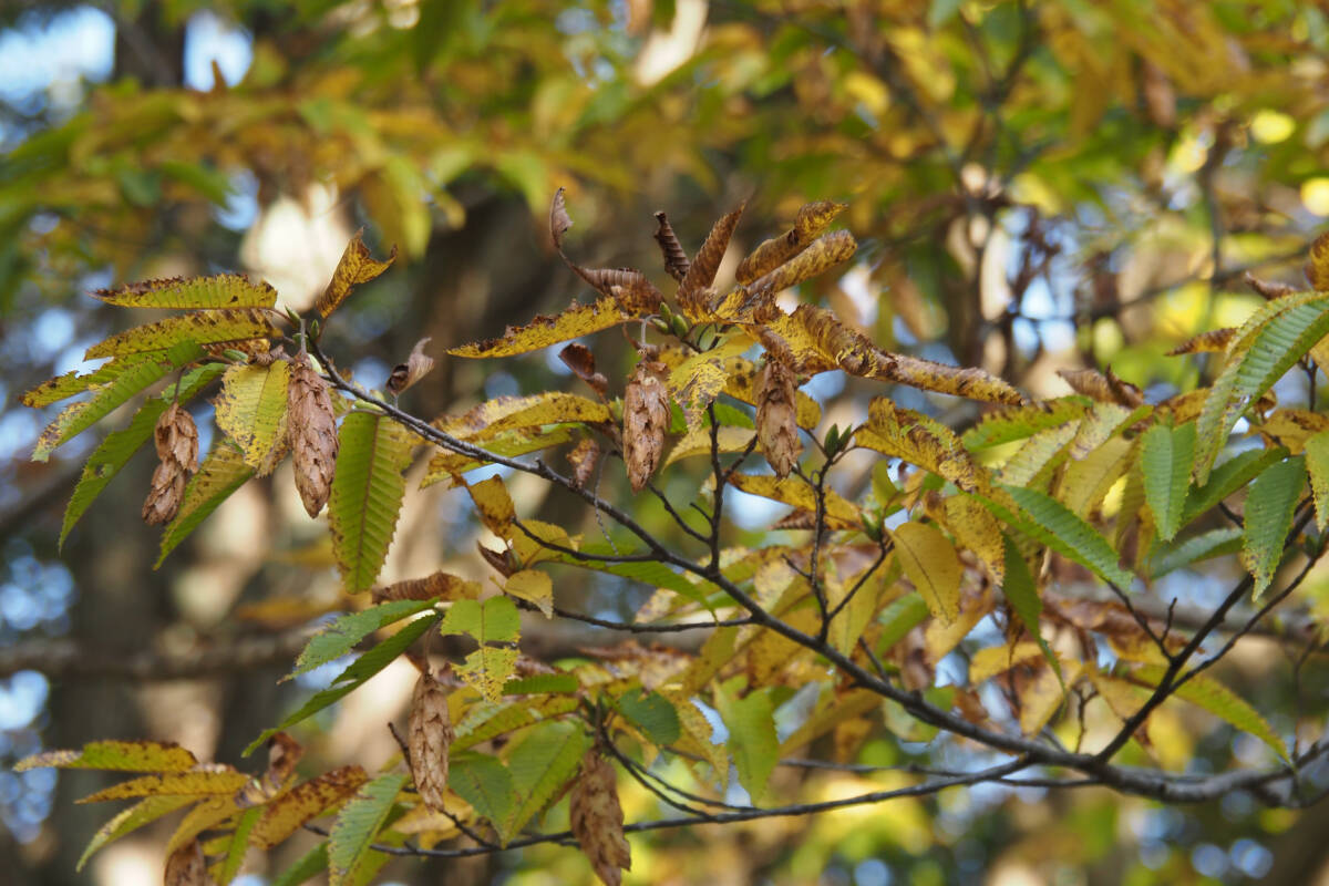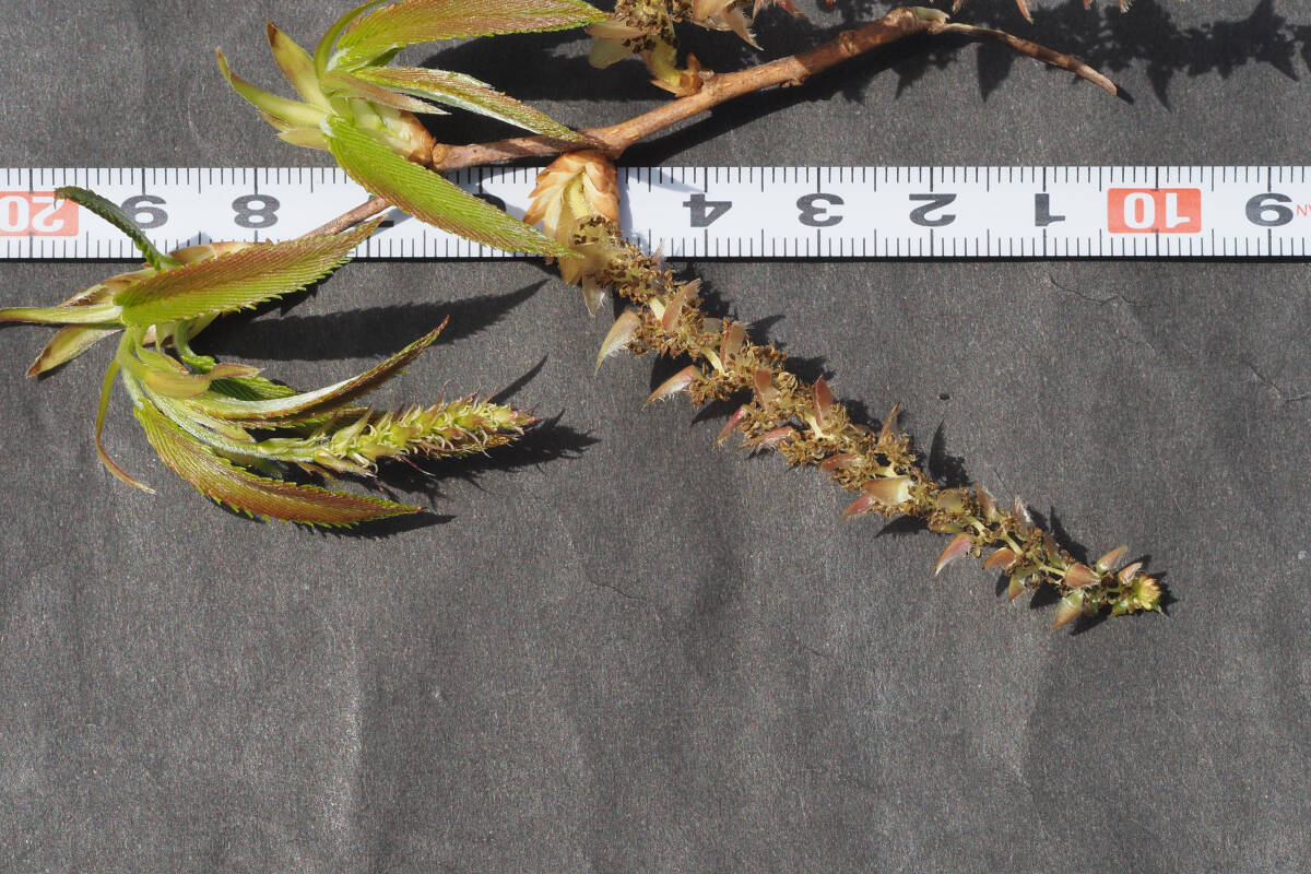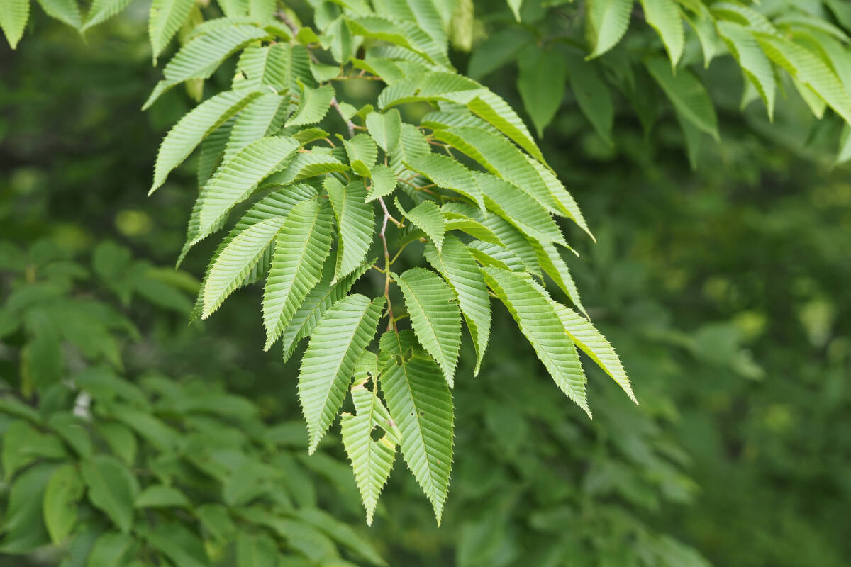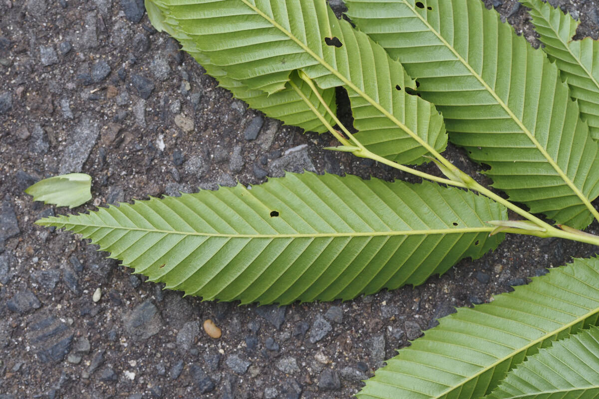 本州から九州までの日当たりの良い山地や丘、また谷筋まで広い領域に生育している日本固有種です。樹高は15mほどになり、樹皮は黒褐色。若い個体はイボ状の皮目が目立ち、生長するにつれてその皮目が縦に連なってミミズばれ状になり、老木になるとその部分が裂けて剥がれてきます。葉が展開する4月、同時に花を咲かせます。雄花序と雌花序があり、長さ3〜5cmの雄花序は前年枝の複数箇所から垂れ下がり、長さ2cmほどの雌花序は枝の先端もしくは先端近くにある短枝の腋から垂れ下がります。雌花からベロを出すかのように突き出ているのは花柱です。長さが5〜10cmの果穂に60個前後つく果実は10月ごろ熟しますが、葉状の果苞の基に堅果が付着していて、これが竹トンボの羽のような役割をして落下時に散布されます。数多くの果苞に包まれた果穂はさながら蓑を被ったミノムシです。葉身が5〜12cmある狭楕円形の葉には15〜24対の側脈があり、葉の裏に突き出ています。[1][2][3]