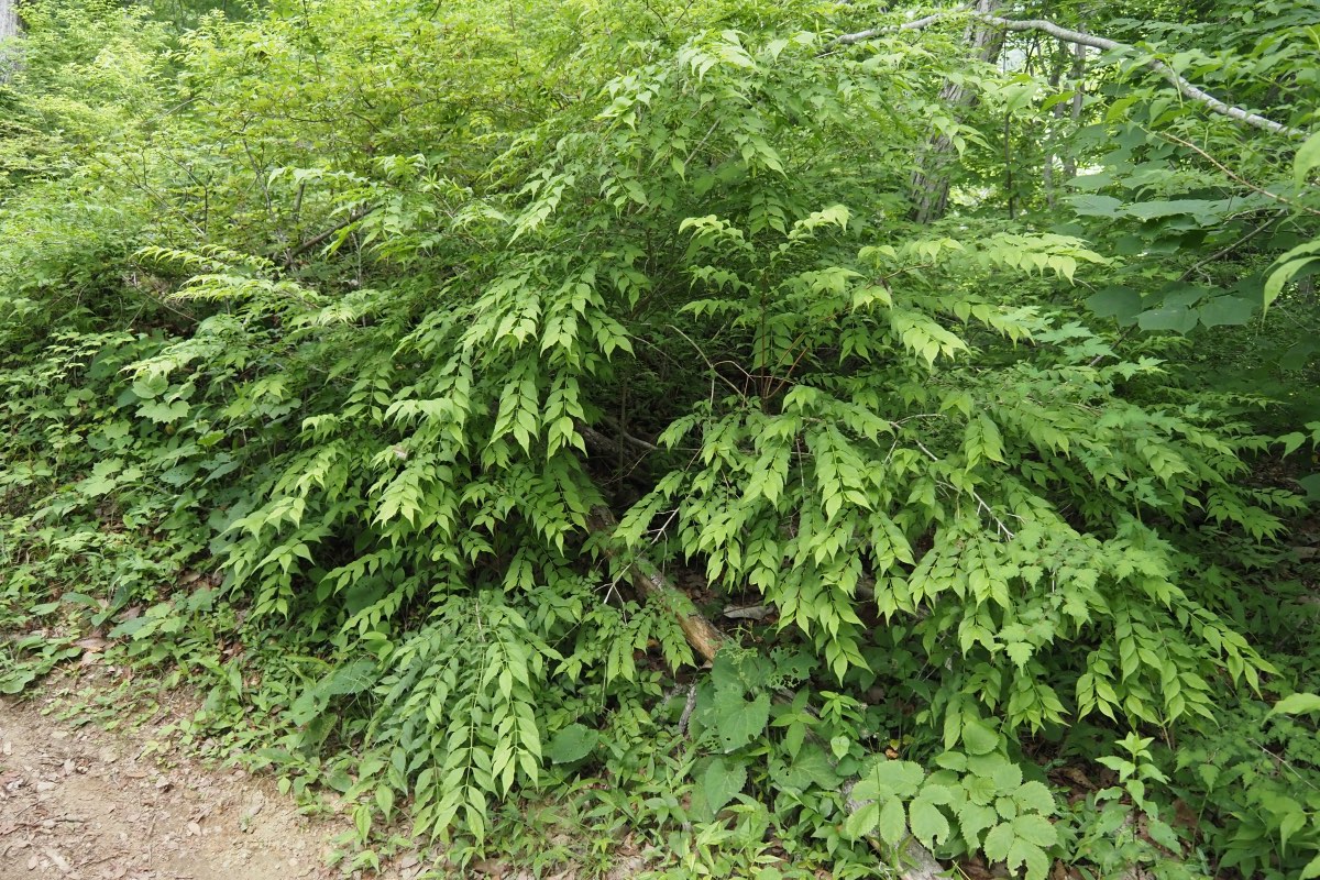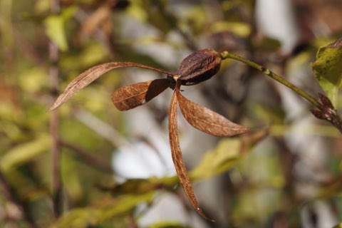 東北南部から九州までの丘陵や山地にある林内のやせた土地に自生しています。樹高は2m程度でよく分枝して垂れ下がるため横に広がりやすいです。樹皮は灰白色です。葉身が3〜10cmの先が尖った葉は長い枝に対生し、緑色の若い枝から出ている葉を見ると偶数羽状複葉の様にも見えてしまいます。鋸歯はなく全縁ですが、縁には細かい毛が並んでいて鋸歯があるようにも見えます。5〜6月、枝先に花を咲かせます。雌雄異株ですので雄花と雌花は別々の株に咲きますが、いずれも葉と同じ緑色で小さいため目立ちません。特徴的なのは果実の形状です。花についている苞が長く先に伸び、苞の手前にある果実は楕円形に膨らみます。その形はまさしく羽根つきの衝羽根です。11〜12月には果実が茶色く色づき、長く伸びた苞を翼にして風に乗って落下しながら散布されます。翌年の春まで落ちずに残っていることもあります。若葉はおひたしに、若い果実は苞を付けたまま塩漬けにして正月料理の飾りに、種子は煎って食べることもできるそうです。[1][2]