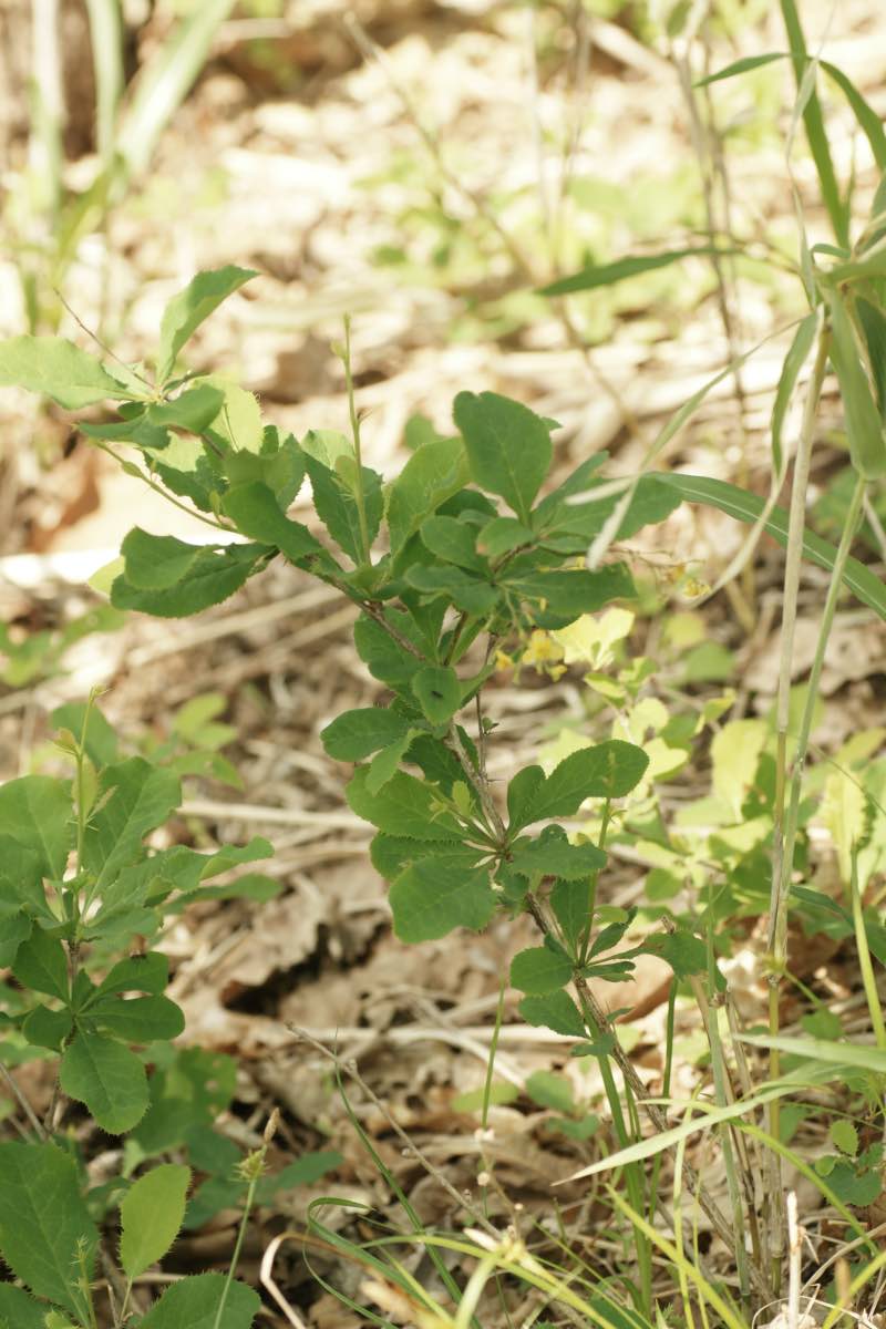 広葉樹林内、蛇紋岩やかんらん岩の土地に多く自生しています。平地だと高さが3mにもなりますが、山地ではそれほど高くなりません。樹皮は灰褐色で縦に裂けますが、灰白色の枝もあります。枝には棘が多く、その名の由来にもなっています。葉には刺状のするどい鋸歯があります。5〜6月、総状花序に黄色い小さな花を咲かせます。果実は楕円形で赤く色付きます。[1]