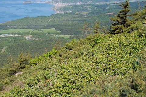 蛇紋岩はかんらん岩が水と反応して変性した岩石です。いずれも超塩基性岩で、植物の生長に悪影響を及ぼします。マントルの上部にあるかんらん岩は地殻変動によって地表に出てくることがありますが、その過程で変性しやすくかんらん岩を地表で見ることができるのは珍しいことなのです。そのかんらん岩で有名なのが北海道の様似町にあるアポイ岳です。その厳しい生育環境にあるアポイ岳には固有植物が多いことでも有名で、その斜面のいたるところにヒロハヘビノボラズが自生しています。他の樹木が生育し難い土地でも何とか生きていけることでその地で繁栄できるのが当種です。