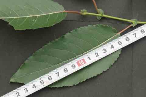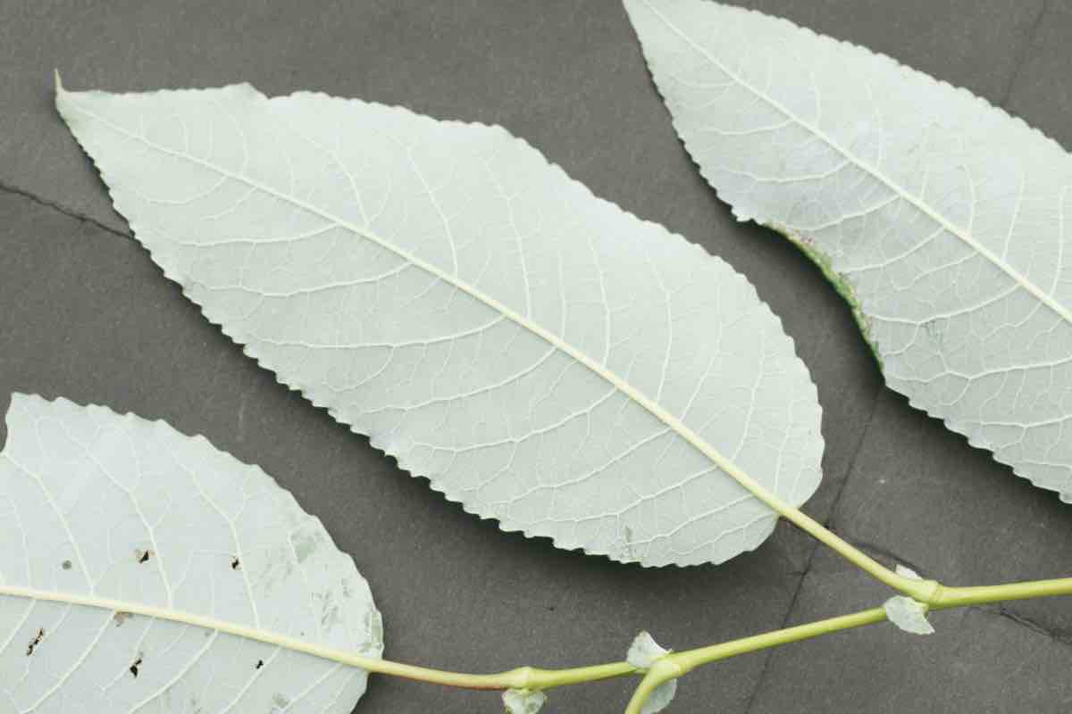 葉は長さ10〜20cmの長楕円形で細かい鋸歯があって、裏は粉白色、葉の先端は尖ります。