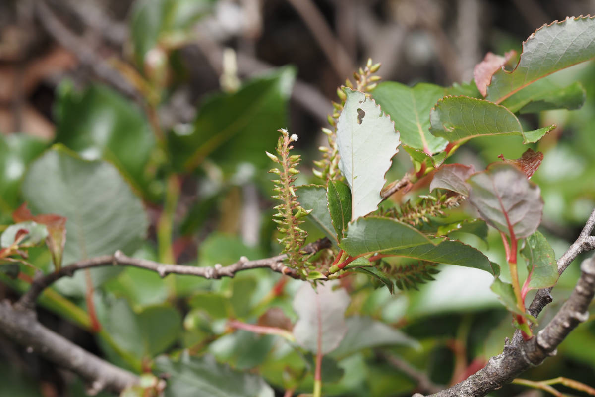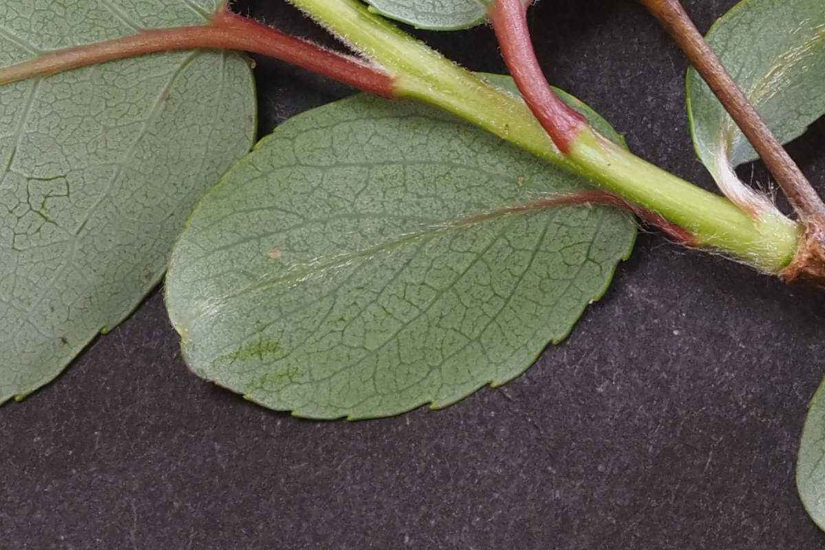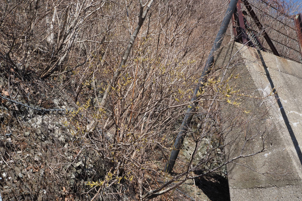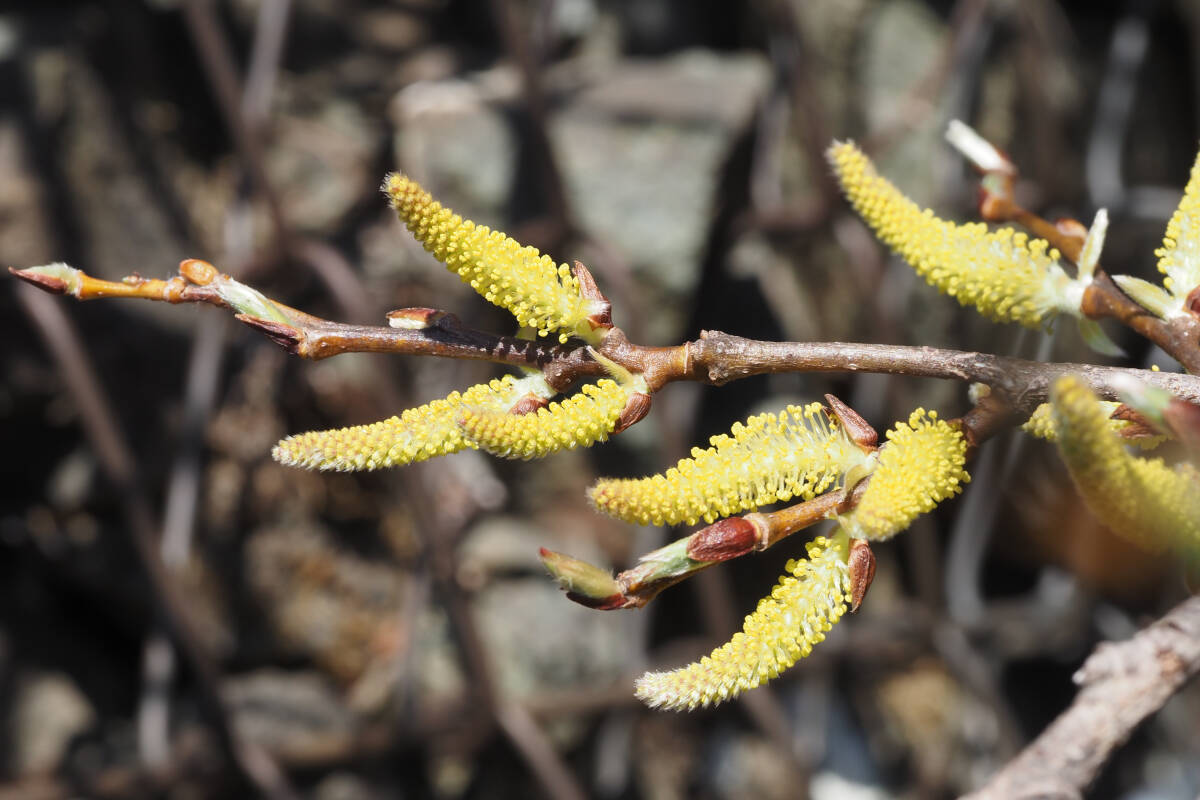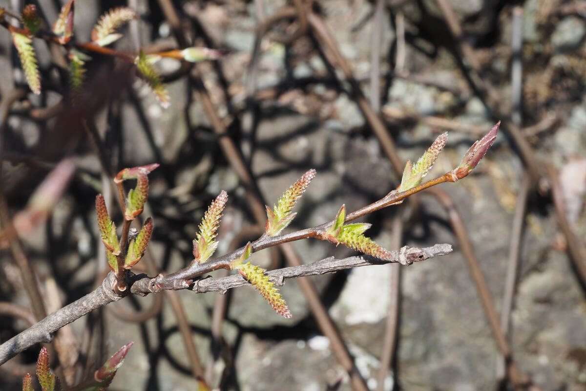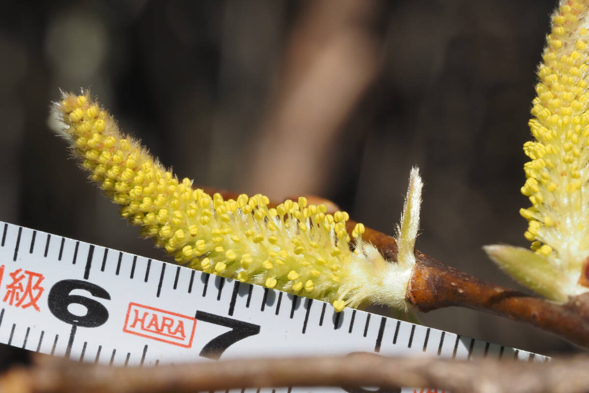 本州の山形県と宮城県から長野県までの山地の岩場に自生している日本固有種です。大きいものだと樹高が1mほどになり、株立ちしてごつごつとした樹皮は灰褐色です。一年枝は黄褐色で横や下向きに伸びます。若い時に赤みを帯びる葉の葉身は4〜8cmほどで、裏は粉白色です。枝の基側にある小さな葉の裏には絹毛が生えていることがあります。葉が展開するのと同時に開花します。一般に5月上旬から中旬に開花するようですが、写真の撮影地である峩々温泉の近くでは3月下旬から4月上旬に開花していました。他のヤナギと同じような花序ですが、白い軟毛が密生しています。果実は6月に裂開して綿毛のついた種子を風に乗せて飛ばします。[1][2][3][4]