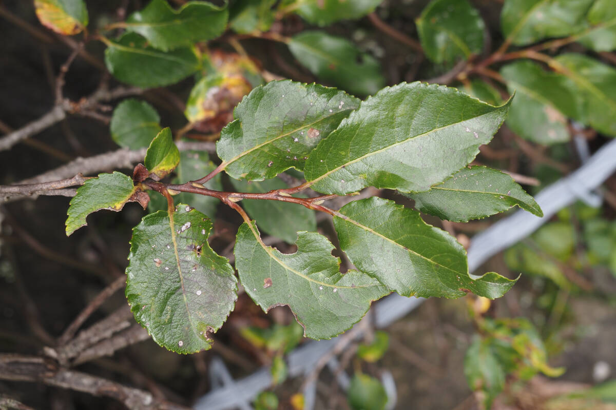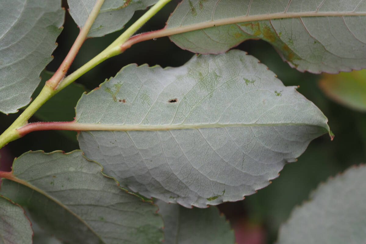 若い時は赤みを帯びる葉の葉身は4〜8cmほどで、裏は粉白色です。