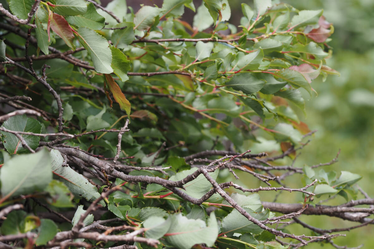 ごつごつとした樹皮は灰褐色で、一年枝は黄褐色で横や下向きに伸びます。