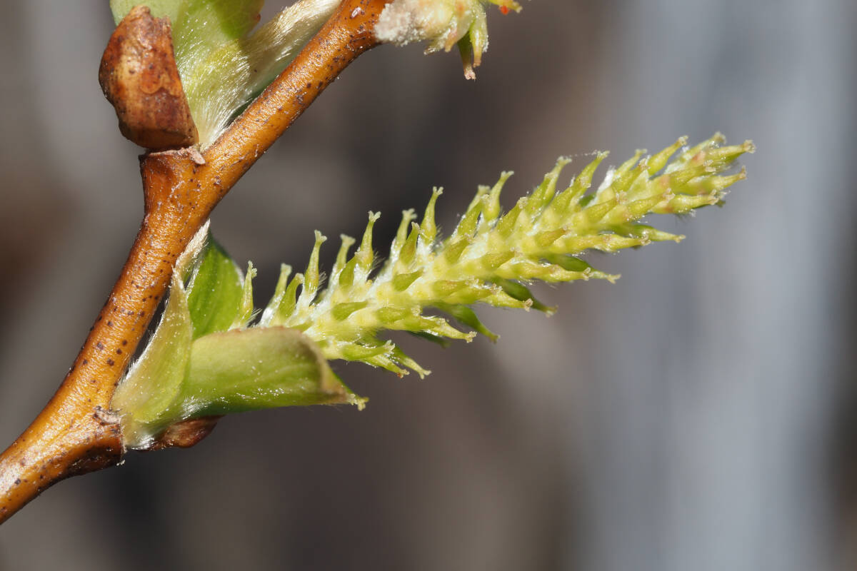 他のヤナギと同じような花序ですが、白い軟毛が密生しています。