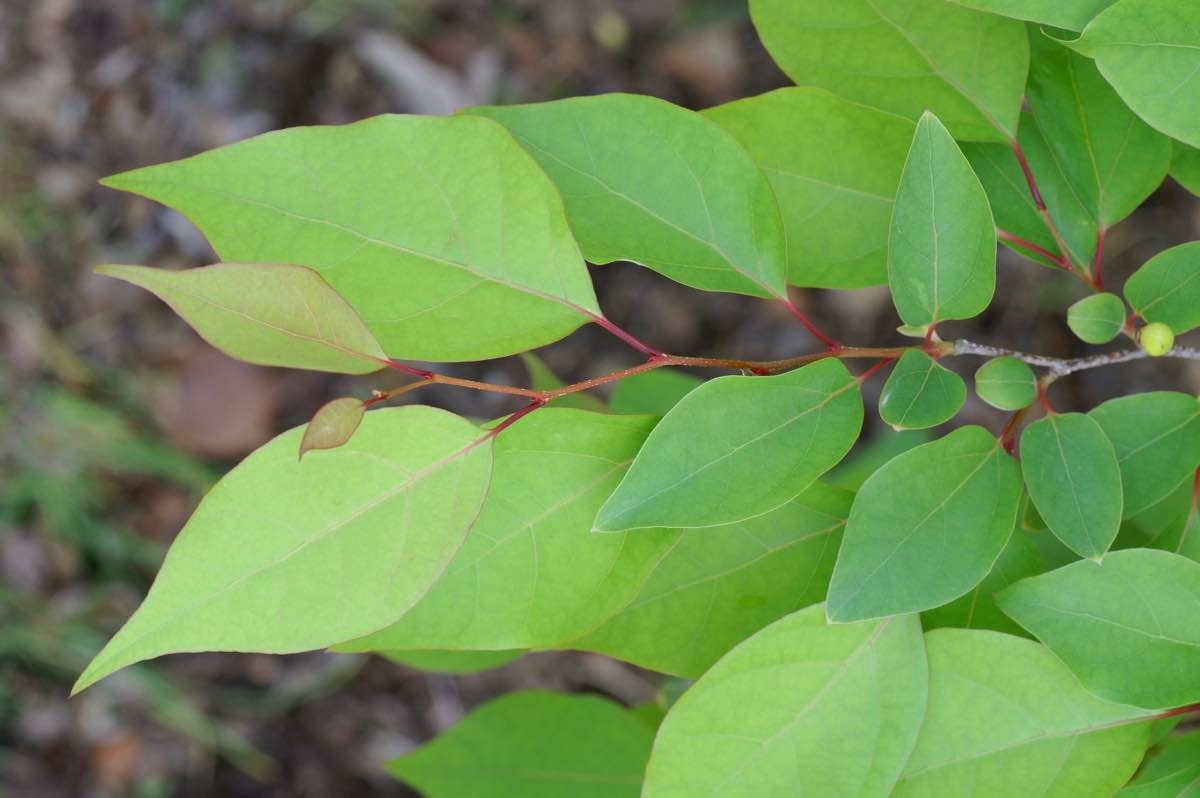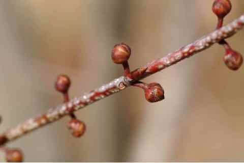 枝の左右両端に2個づつ球形の花芽が長さ4mm程度の柄の先に、また枝にくっつく様にして紡錘型の葉芽があります。