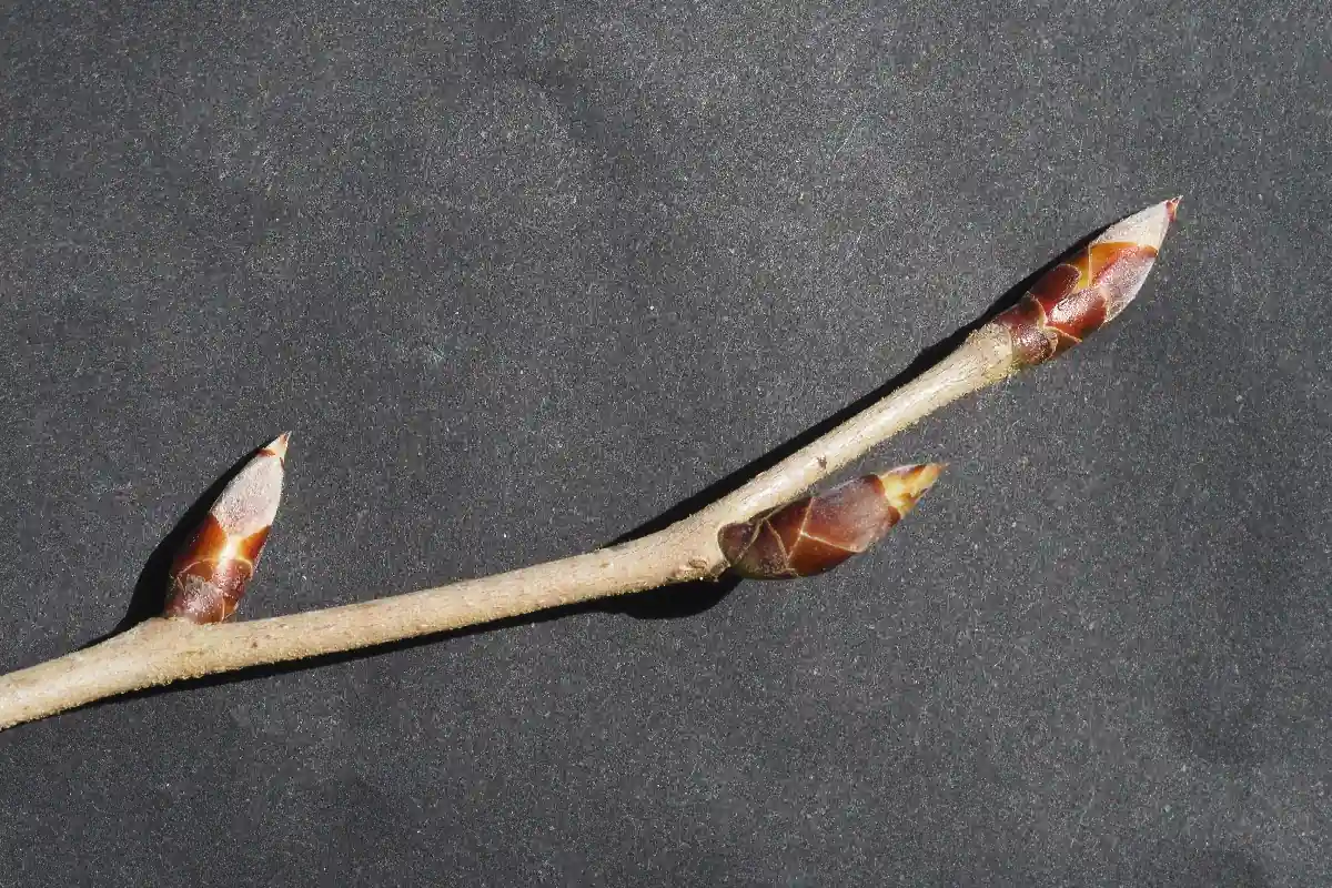 花を咲かせる冬芽は葉と花が一緒に入っている紡錘形の混芽です。