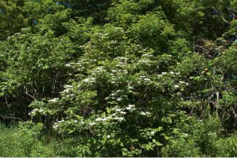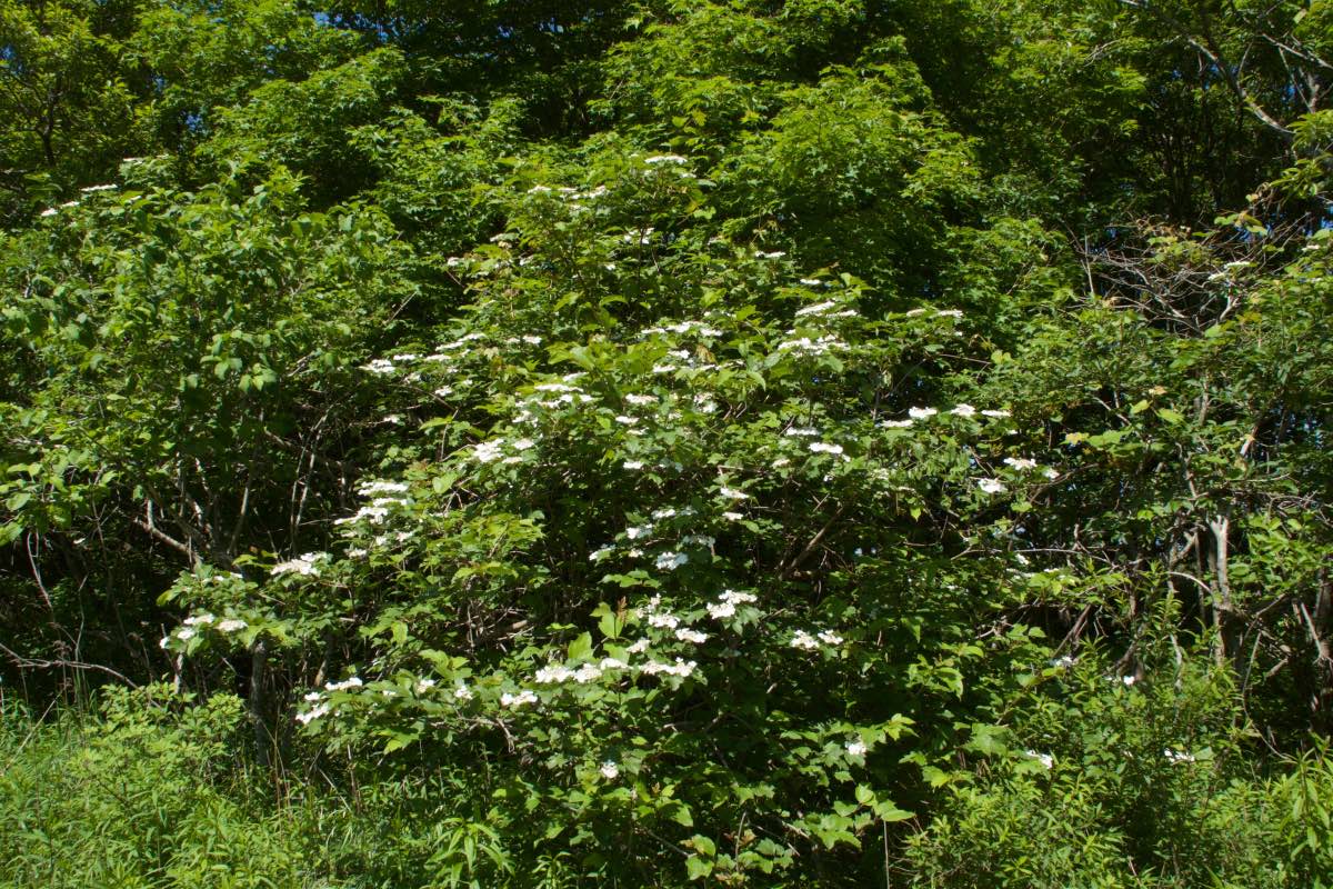 北海道と本州の山地の林内に生えています。北海道では平地でもよく見られ、一方の本州では中部以北の主に日本海側や内陸部に生育しています。株立ちして高さは6mほどになります。5〜7月、枝先に散房花序の花を咲かせます。アジサイ属のように周りに装飾花が、その中心に多数の小さな両性花が付きます。ただしアジサイ属の装飾花は萼が変化したものですが、カンボクの装飾花は他のガマズミ属と同様に花冠が大きくなったものです。9〜10月に球形の赤い果実が実ります。広卵形の葉は特徴的で3つに分裂して粗い鋸歯があります。中には分裂しない葉、アサガオの葉のような鋸歯の目立たない葉もあります。樹皮は暗灰褐色です。[1]