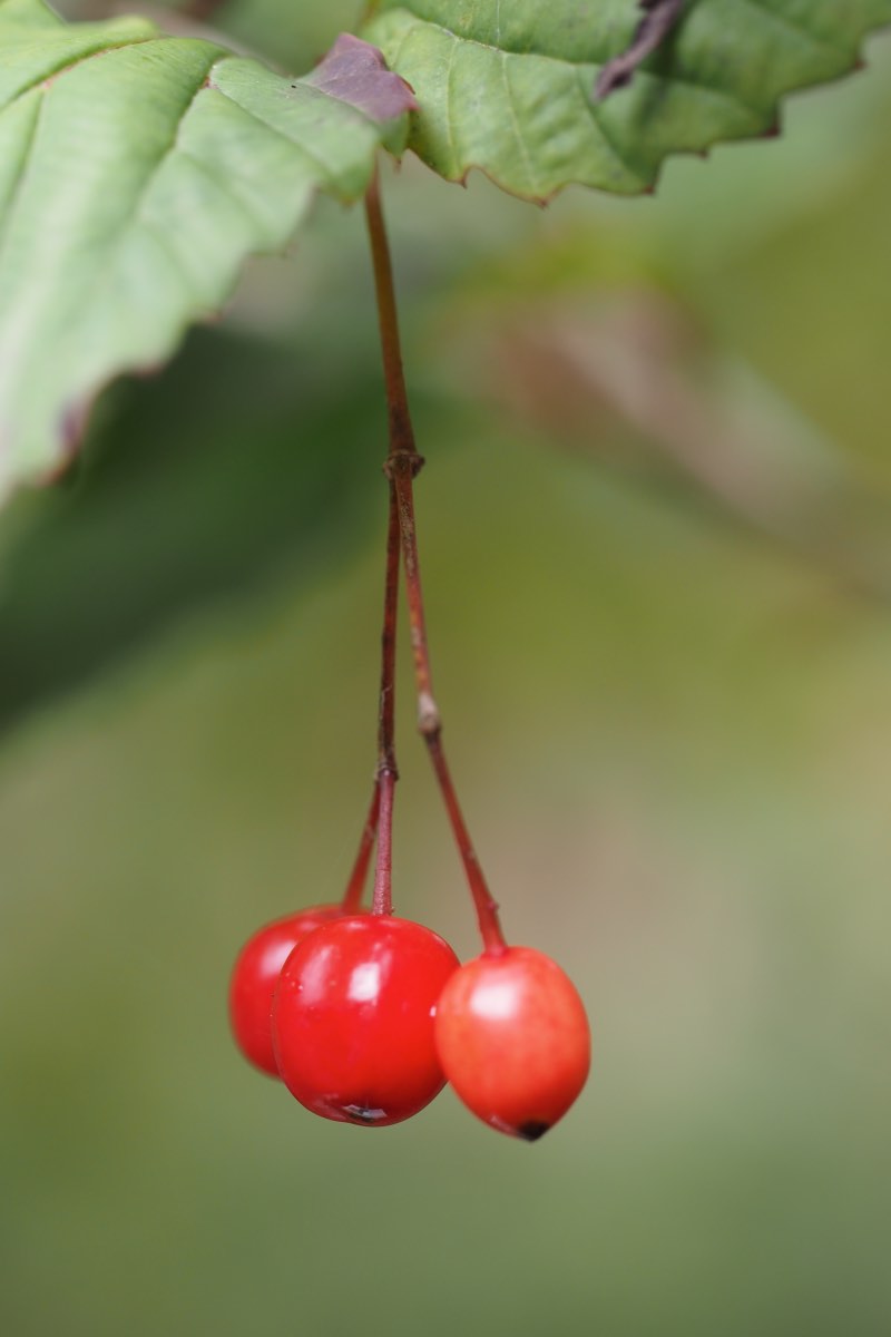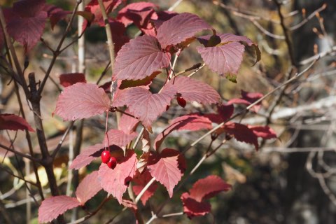 扁平している果実は9〜11月に赤く熟すのですが、光沢のある真っ赤な実と紅葉のコントラストは綺麗です。