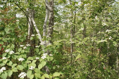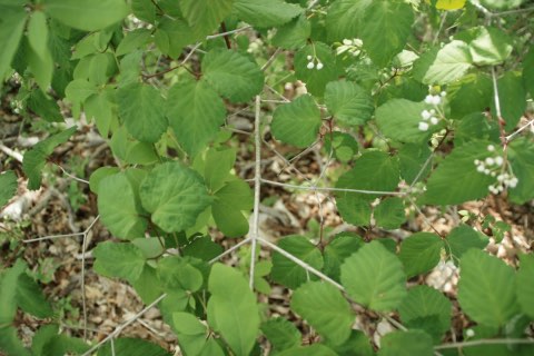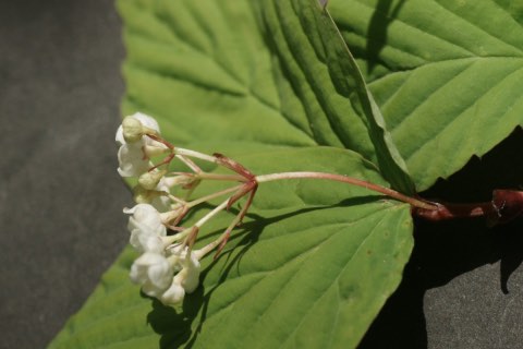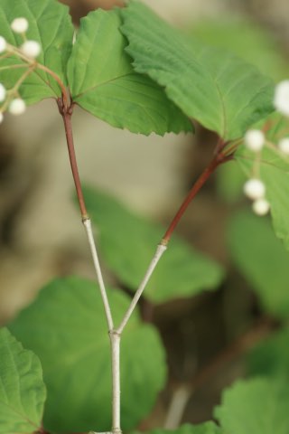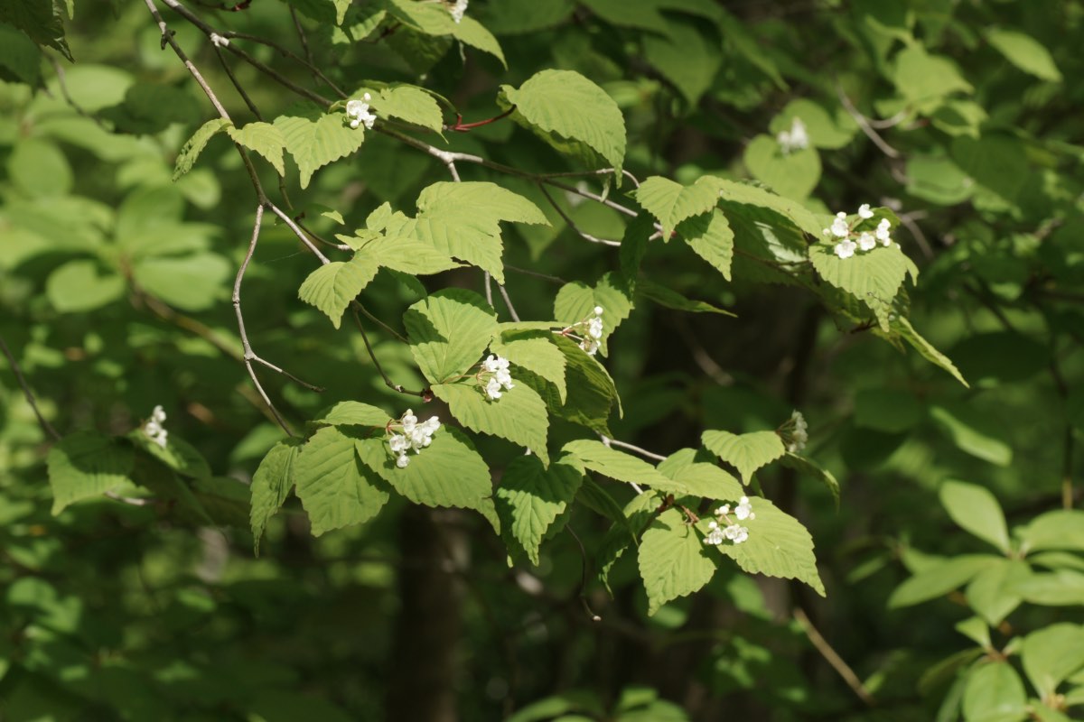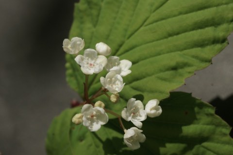 4〜5月、小さな花を枝先に咲かせます。同属のガマズミと違って花序につく花の数は少なく、花と花の間に隙間が見えるほどです。