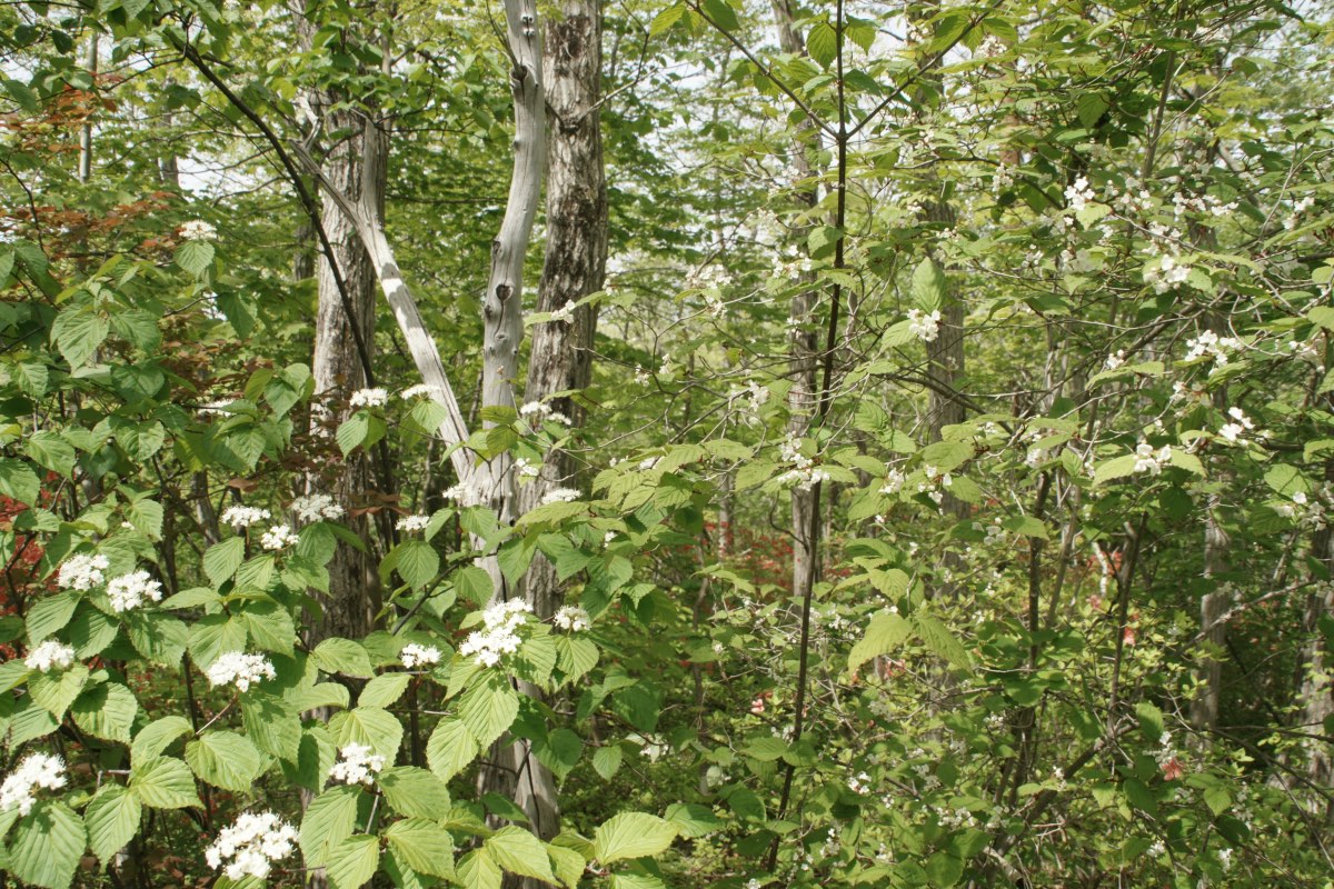 本州、四国、九州の陽の光が入る林内や林縁に見られます。宮城県が北限で北陸地方までの日本海側には自生していません。日本固有種です。分枝しやすく、樹高は3mほどになります。葉身が4〜9cmの葉は先が尖り、縁には階段状の鈍い鋸歯があります。枯れて乾燥すると葉が黒く変色するのがオトコヨウゾメの特徴です。4〜5月、小さな花を枝先に咲かせます。同属のガマズミと違って花序につく花の数は少なく、花と花の間に隙間が見えるほどです。花弁は白いのですが紅色を帯びることが多く、雌しべの先端も紅色、また細長い苞も紅色を帯びています。扁平している果実は9〜11月に赤く熟すのですが、光沢のある真っ赤な実と紅葉のコントラストは綺麗です。樹皮は灰褐色、先端につく若い枝は赤褐色でよく目立ちます。[1][2][3]