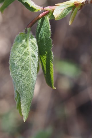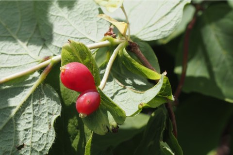 新潟県の佐渡島にはこのアラゲヒョウタンボクが海抜0mの海岸から標高1172mの金北山山頂付近まで自生しています。佐渡島では身近な花のようで、山仕事の始まりを告げる早春に咲く花として「ヨメナカセ」または「ムコナカセ」と呼ばれているとか。また、この実は甘くて食用にしていたとのことです。同属でもネムロブシダマやキンギンボクの果実は有毒、ハスカップの名で有名なクロミノウグイスカグラや当種が食用にできるとは、スイカズラ属とはよくわからない属ですね。[4]