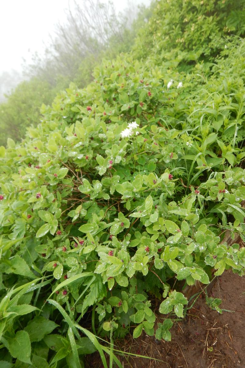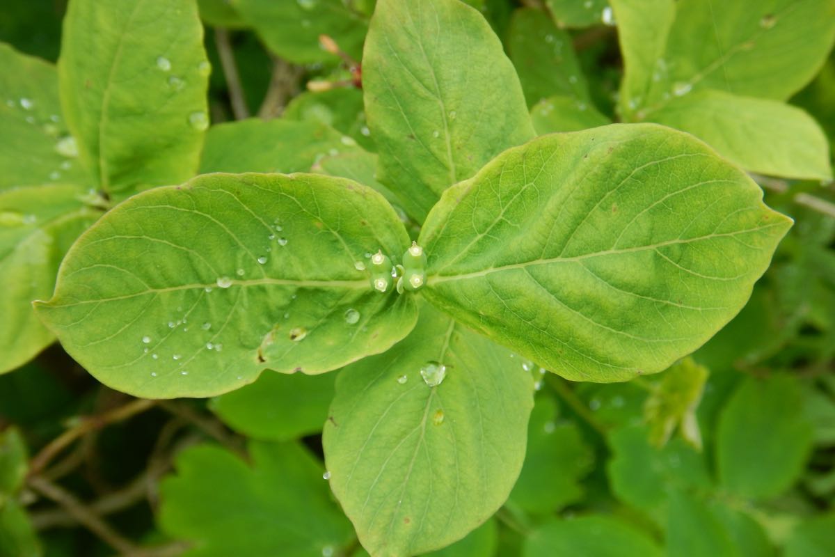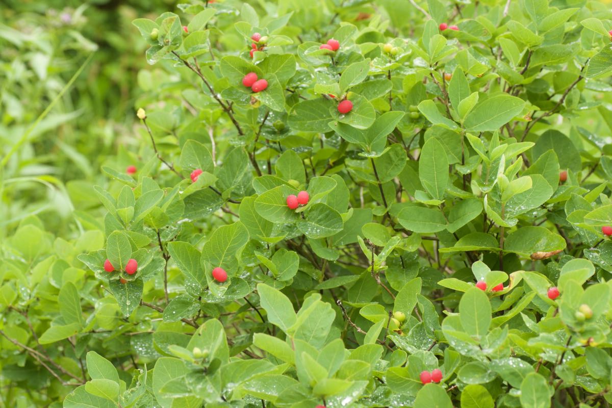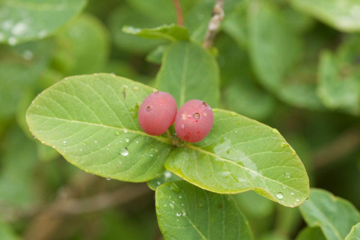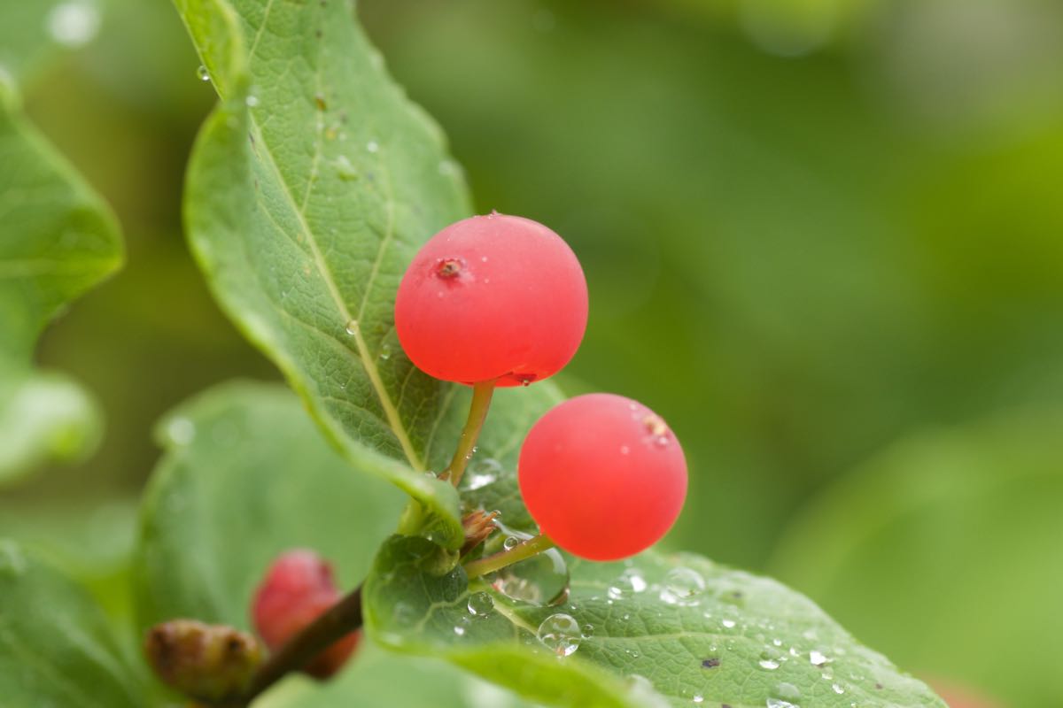ヒョウタンボクの仲間で花が赤いのは同種とベニバナヒョウタンボクしかありませんが、チシマヒョウタンボクは葉が無毛で葉先が丸くなっているのに対して、ベニバナヒョウタンボクは先が尖り、また葉の裏や葉縁に細長い毛がところどころあるのが特徴的です。ヒョウタンボクの実には毒があるというのが通説です。ところが、北海道の山で食したチシマヒョウタンボクの実は甘くて美味しかったとおっしゃる方も中にはいて、毒については真偽不明です。