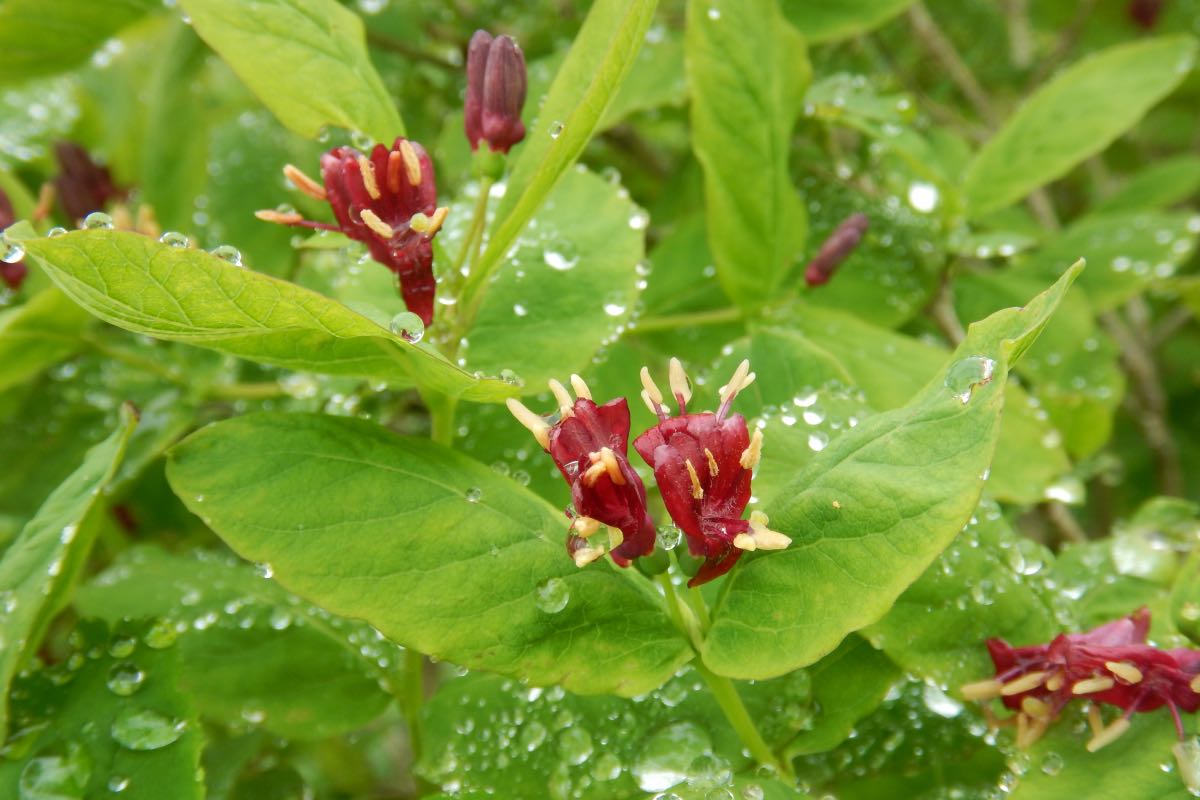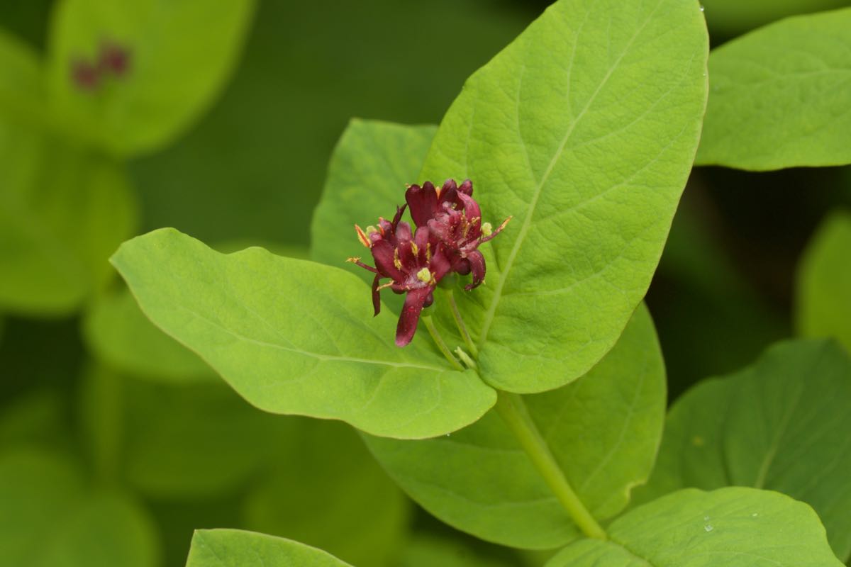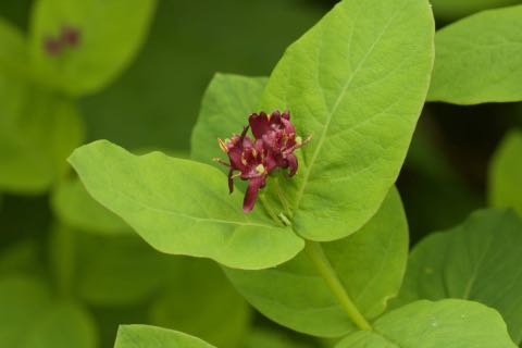 国内では北海道と本州南アルプスの亜高山〜高山に自生しています。樹高は0.5〜1.5m。葉は長さ2〜6cmの楕円形または広卵形で、先は丸いか鈍く尖ります。新しい枝の葉腋から通常は2つの花柄が伸びて、その先に2つずつ6〜7月に花を咲かせます。花の色は濃い赤で、ワインレッドまたは血液のような色(血紅色)と形容した方が合っているかもしれません。唇型花冠で、上唇は4裂していて下唇は下に垂れ、また花弁に白い毛が見られます。1つの花柄から出る2つの子房は、果実が生長する過程で合着します。果実はまだ若い時期には2つ別々ですが、やがて合着して球形に近い楕円体の1つの果実となり、7〜8月に赤く熟します。熟した果実をよく見ると、果頂が2つあることから合着していることがわかります。[1][2][3]