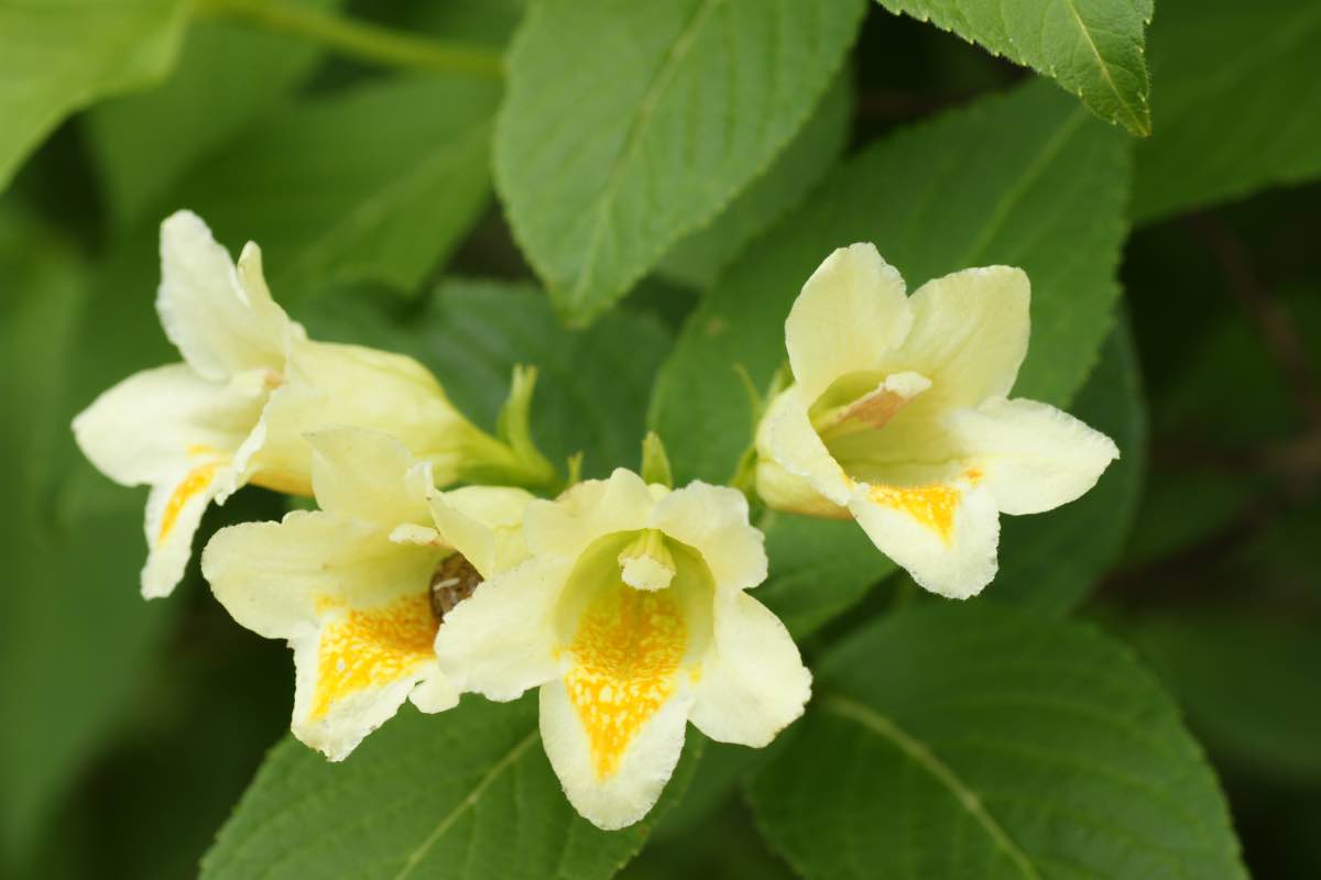 ウコンウツギはその花の形から口吻の長いハナバチに適していると考えられます。そのため、口吻の短いハナアブよりもハナバチが訪花することが多いようです。