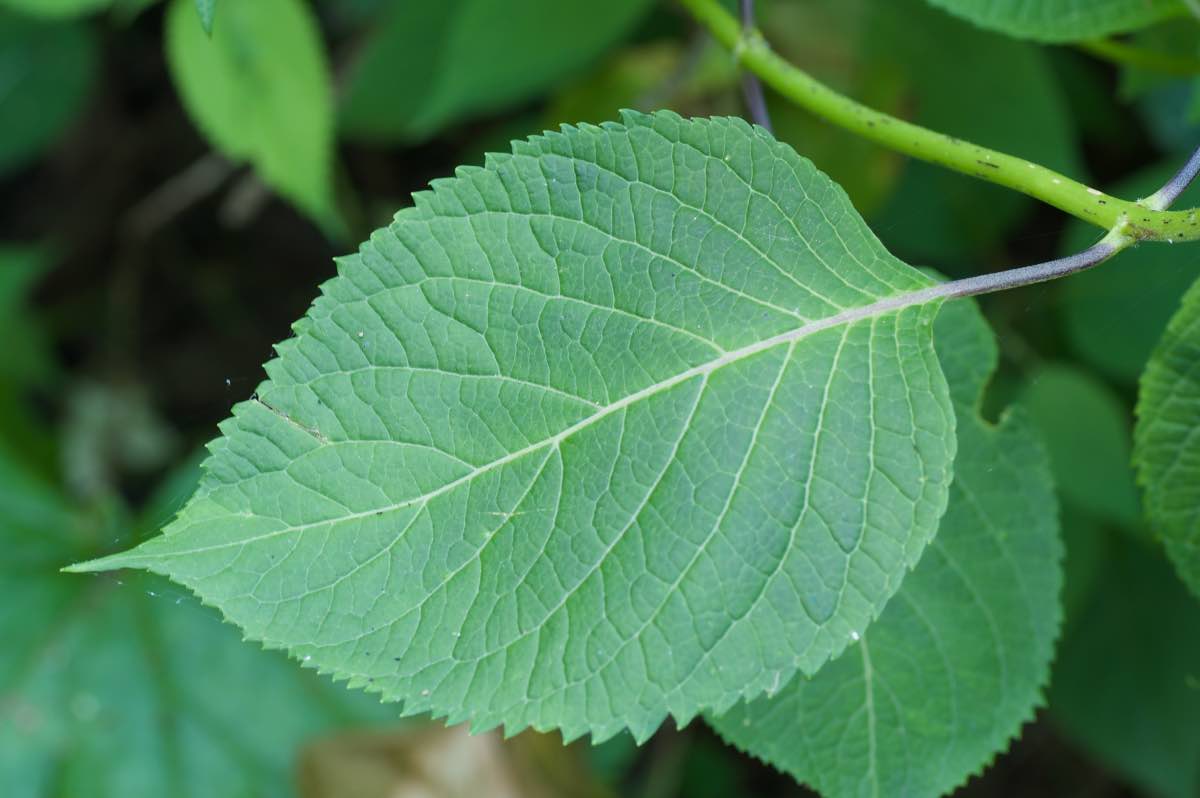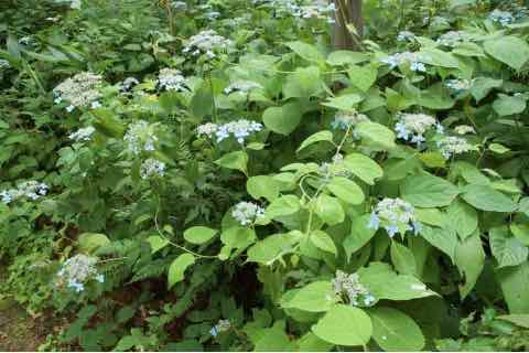 主に北海道の西側、本州の日本海側を中心に分布している日本固有種です。山地の林内の暗く湿った土地に生えています。根より複数の褐色の幹を立ち上げ、高さ1mほどになります。葉は長さ10〜17cmの幅が広い楕円形で先端が尖り、葉縁には深めの鋸歯があります。その大きさは同属の中で最も大きいです。表面に光沢はありません。6~8月に直径10〜17cmの散房花序の小さい花が咲きます。花序の周囲に萼が発達した淡青色から青紫色の直径2cmほどの装飾花が付きます。果実は長さ5mmの卵形で、9〜10月に熟します。[1][2][3]