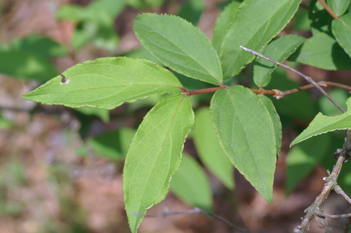 北海道南部から九州まで、日当りの良い山野によく生えています。株立ちして高さは1〜3mほどになります。葉は長さ4〜9cmの楕円形で先端が長く尖ります、ほぼ全体的に細かい鋸歯があります。樹皮は灰褐色で、縦に裂けてはがれます。5~7月に約1cmの花弁5枚からなる白色の花が多数咲きます。[1][2]