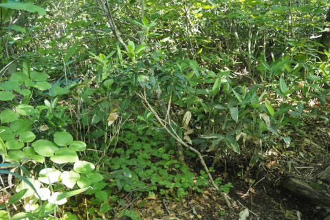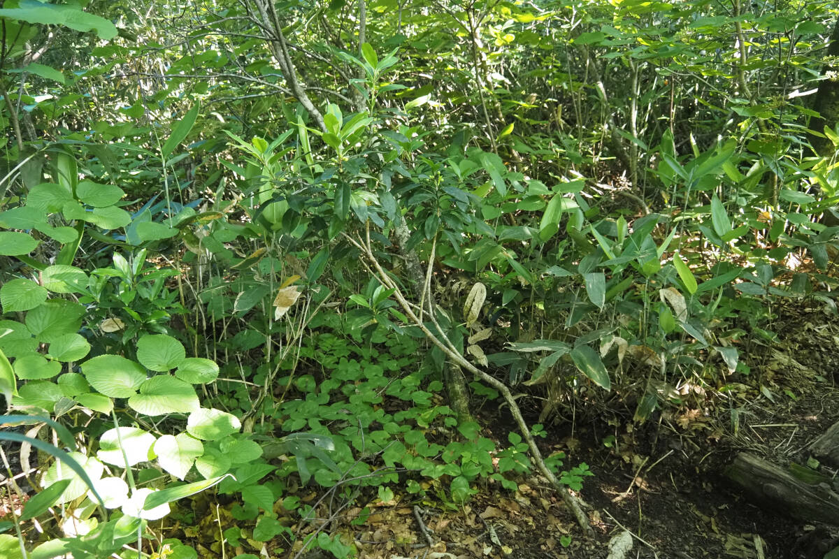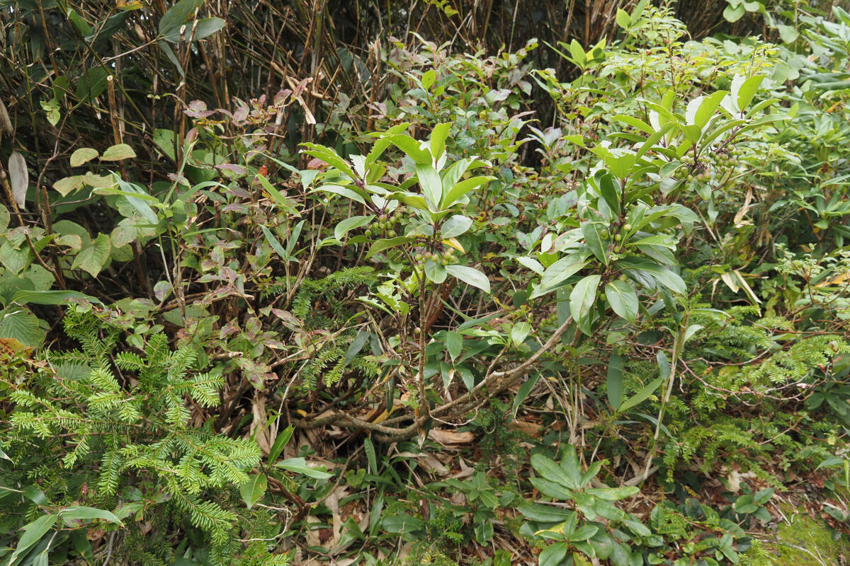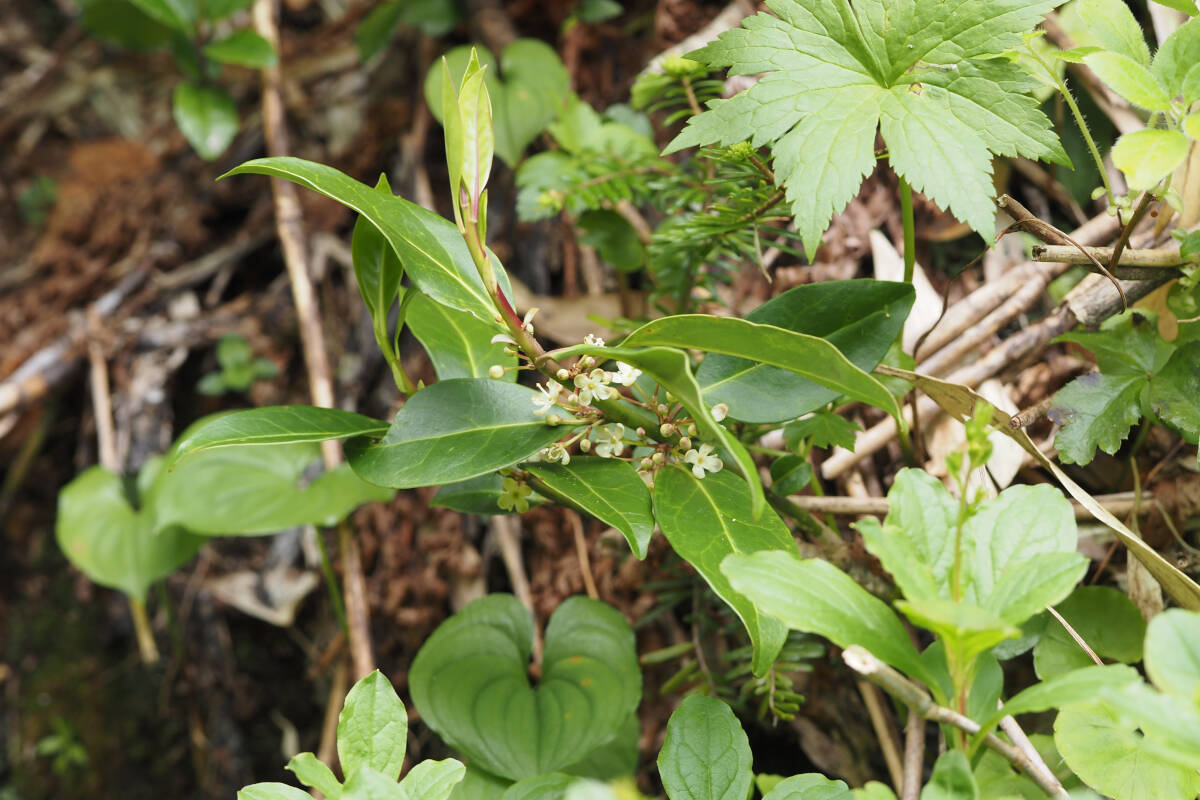 北海道の南西部から本州の山陰地方までの日本海側、主に山地の明るい林内に自生している日本固有種です。樹高は1mに満たず、樹皮は灰褐色ですが、本年枝は緑色や紫褐色になります。常緑の葉は葉身が5〜12cmの狭楕円形で、全縁ではありますがまれに浅い鋸歯を持つものもあります。葉の裏は側脈が不明瞭でのっぺりとしています。当種は雌雄異株で、直径1cmに満たない小さな緑がかった白い花を5〜7月に咲かせます。4枚の花弁と対生して雄しべも4本あり、萼も4枚です。雌花には退化した雄しべが残っています。9〜10月には球状で直径1cmの果実が赤く熟しますが、この実は冬を越して翌年の開花まで残ることがあります。果実に含まれる種子は4つです。[1][2][3][4]