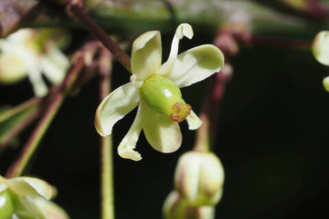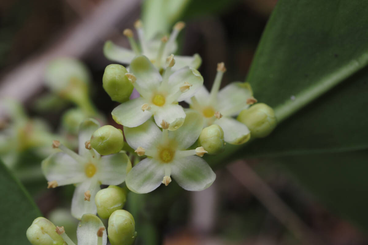 当種は雌雄異株で、直径1cmに満たない小さな緑がかった白い花を5〜7月に咲かせます。