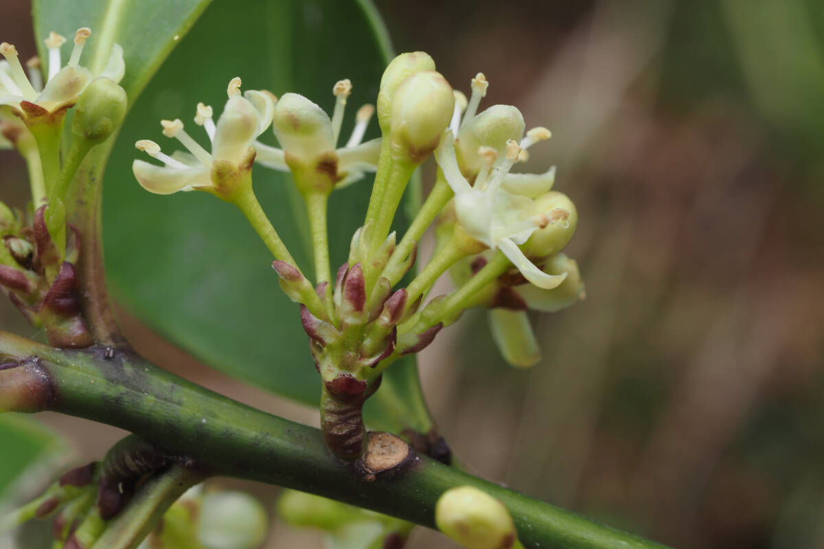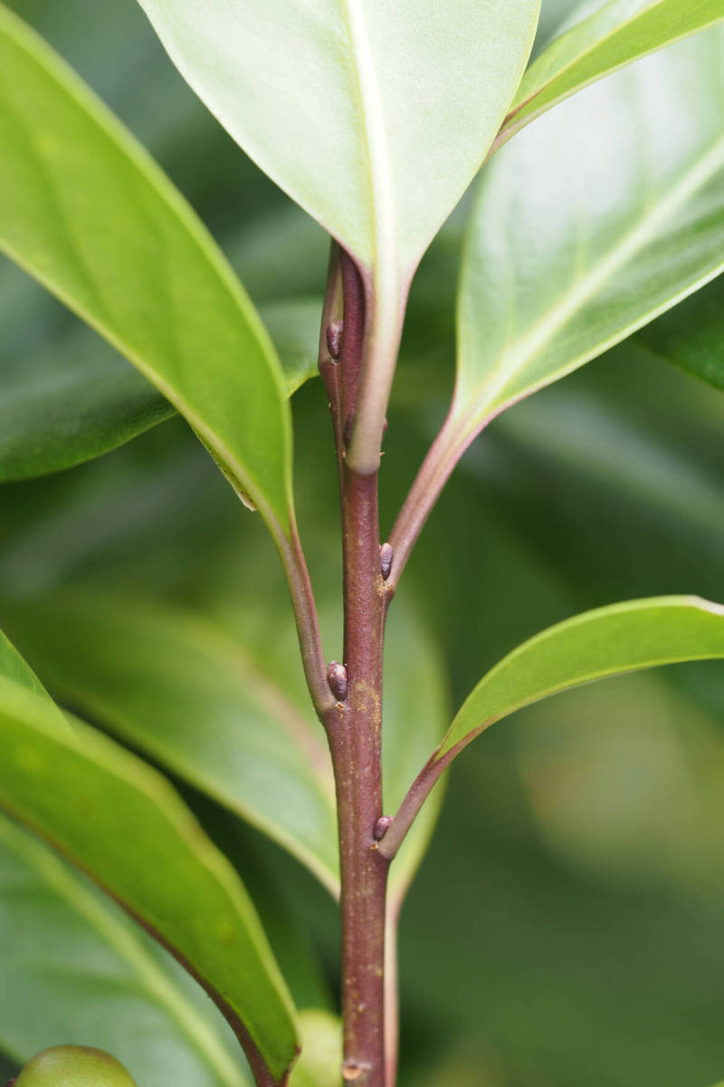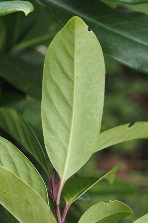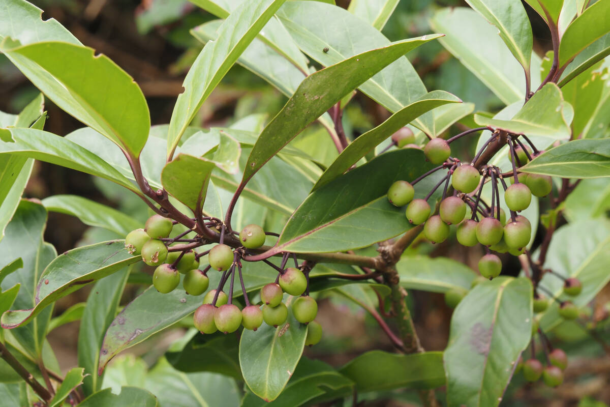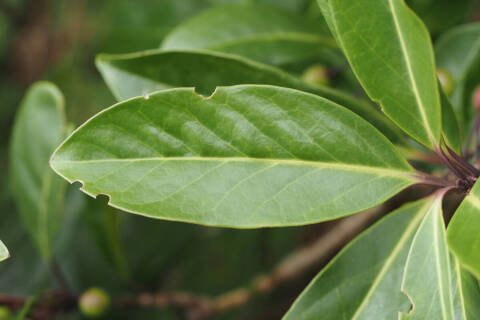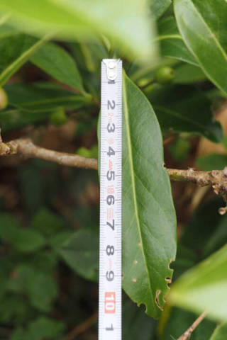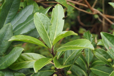 常緑の葉は葉身が5〜12cmの狭楕円形で、全縁ではありますがまれに浅い鋸歯を持つものもあります。