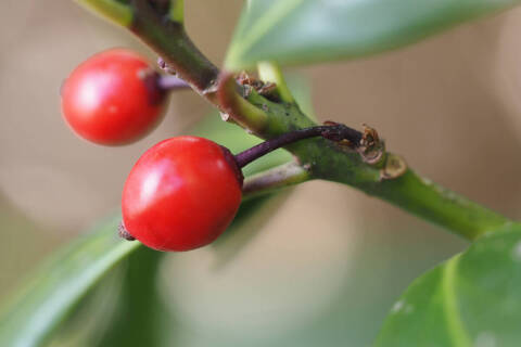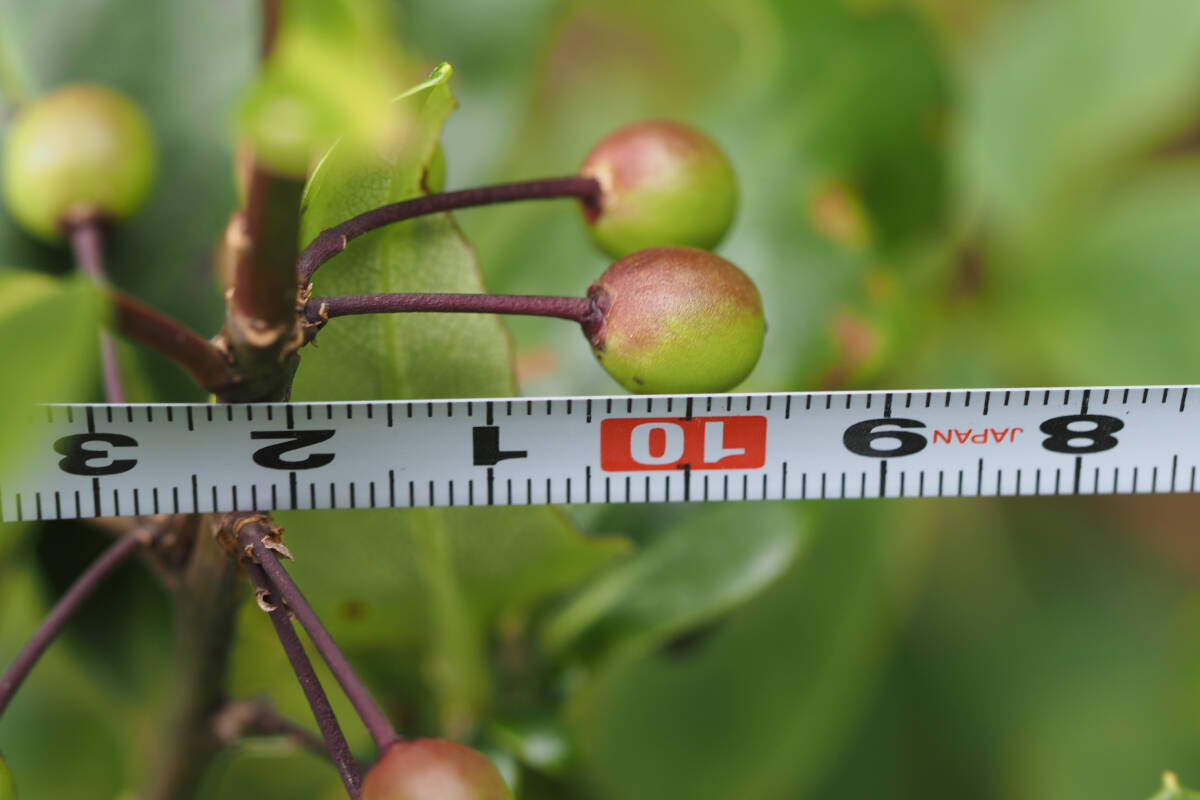 9〜10月には球状で直径1cmの果実が赤く熟しますが、この実は冬を越して翌年の開花まで残ることがあります。