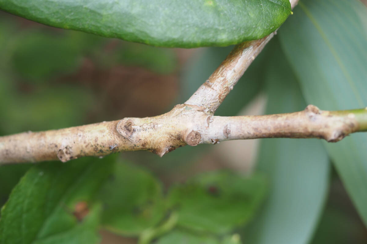 樹皮は灰褐色ですが、本年枝は緑色や紫褐色になります。